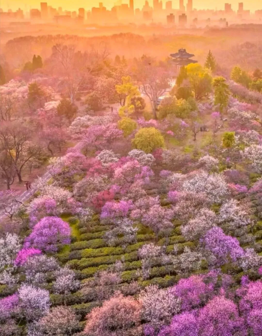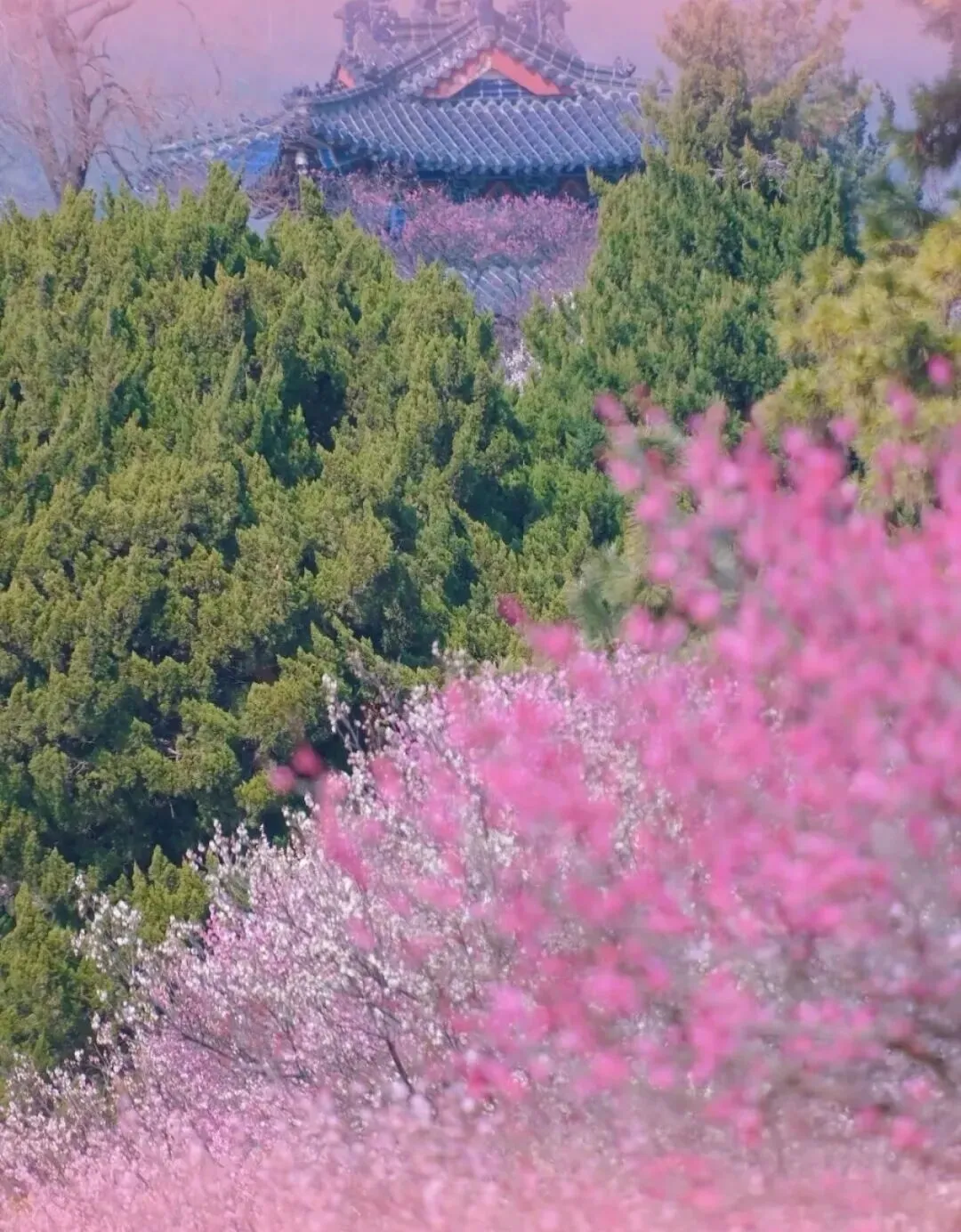 黄瓦朱楼配粉白花海,怎么拍都是国风大片