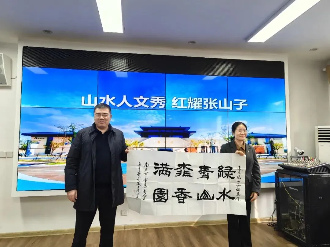 座谈结束时,刘锋会长代表商会向张山子镇赠送了由王振山院长创作的书法作品《绿水青山桃香满园》,寓意张山子镇生态环境优美,产业发展兴旺。双方亲切合影留念,为此次充实而有意义的考察之行画上了圆满的句号。