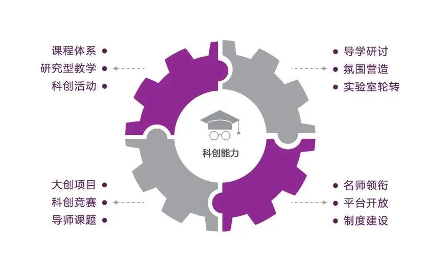 秉持“科研创新能力培养贯穿人才培养全过程”的理念,构建以“志趣为导向、 个性化培养、 追求卓越” 为核心的 “复合三位一体”科创能力系统性培养机制。