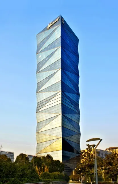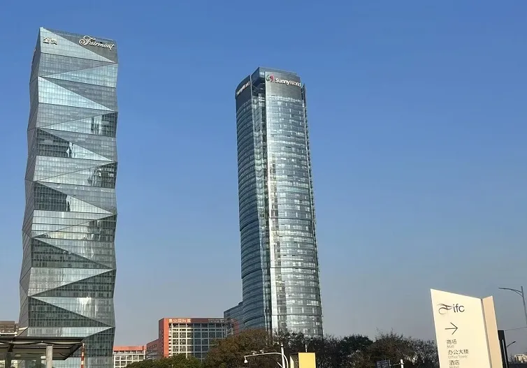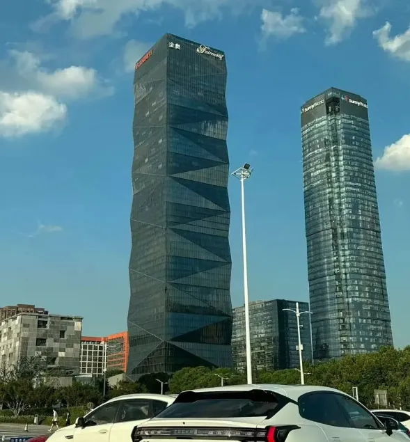 项目的设计灵魂由全球顶级的美国 SOM 设计公司赋予。SOM 作为世界著名的设计机构,曾执笔迪拜哈利法塔、上海金茂大厦等全球地标,其为金奥大厦量身定制的 “折纸灯笼” 造型,将中国传统的文化元素与现代建筑工艺完美融合。塔楼外立面采用双层玻璃幕墙,表面设计成折叠起伏的传统灯笼造型,既体现了中国传统的文化意蕴,又具备卓越的节能与隔音性能。这种独特的菱形纹理在不同的光线下呈现出丰富的视觉层次,与南京厚重的历史文脉相得益彰,成为河西 CBD 极具识别性的城市封面。
