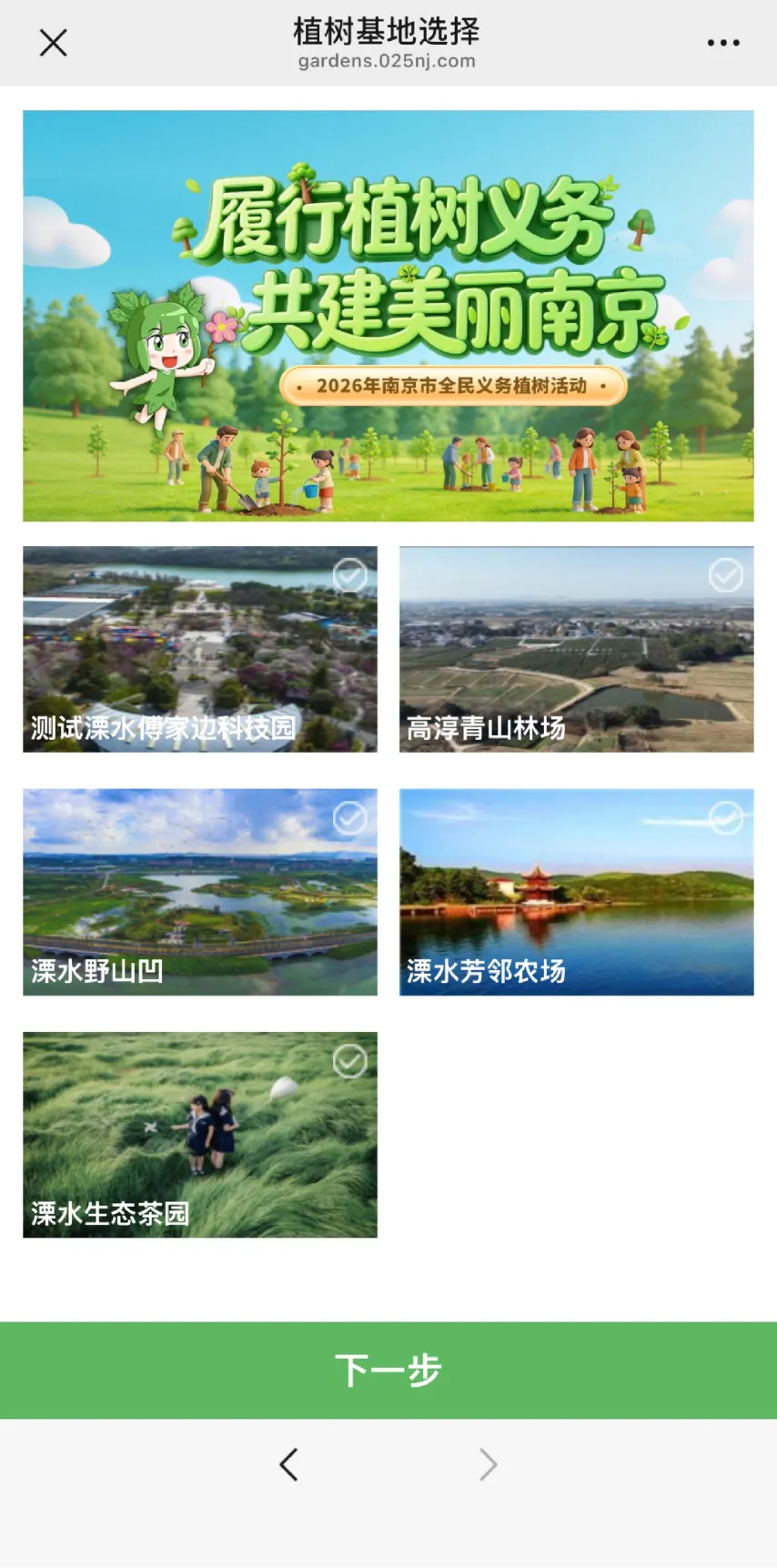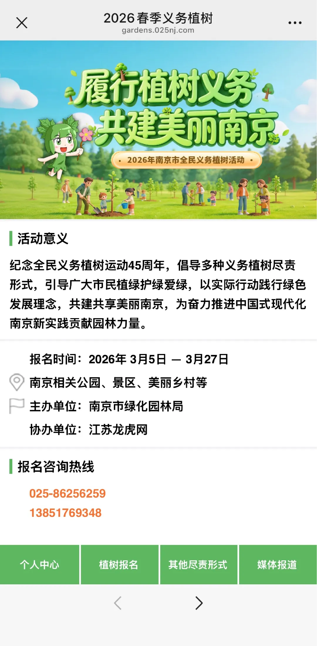 关注南京市绿化园林局微信公众号“南京绿化园林”,点击公众号菜单右下角“绿动你我——2026年义务植树”进入报名页面,填写相关信息。