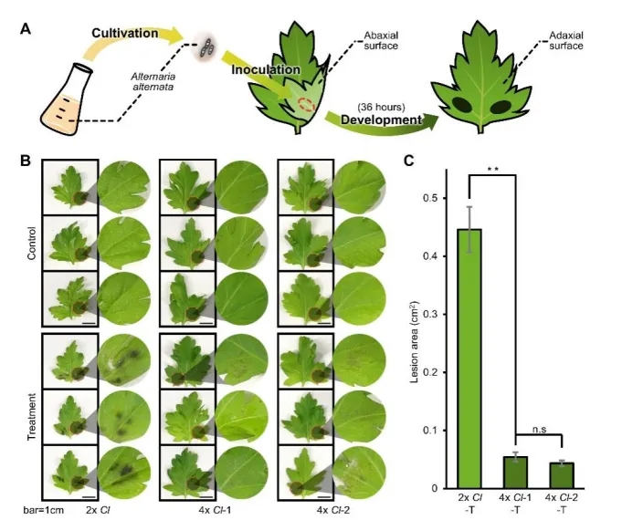 为验证DNA甲基化的调控作用,用DNA甲基化抑制剂 5-氮杂胞苷(5-AzaC)处理二倍体野菊,结果显示处理后植株CHH甲基化水平降低,ClWRKY103被激活,同时黑斑病抗性显著增强,模拟出四倍体的抗病表型,证实DNA低甲基化通过激活WRKY基因调控菊花对链格孢菌的抗性。
