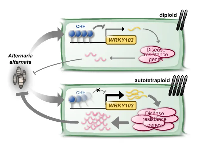 图2 同源四倍体中CHH低甲基化激活WRKY103,增强对链格孢菌的抗性
