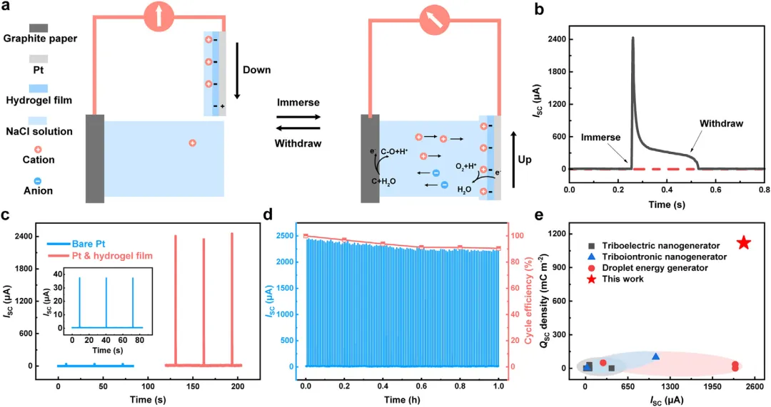 本研究开发了一种高电流水伏器件(High-Current Hydrovoltaic Devices, HHDs),通过动态调控双电层(Electrical Double Layer, EDL)实现了创纪录的电流输出性能。该器件采用聚(乙烯醇)-聚(丙烯酸)(PVA-PAA)水凝胶薄膜修饰的铂(Pt)电极,在周期性浸入-抽出氯化钠溶液的过程中,利用水凝胶网络中固定的聚阴离子与溶液中阳离子之间的相互作用,构建了不对称的双电层结构。该器件实现了高达2432 μA cm⁻²的短路电流密度(Isc)和1120 mC m⁻²的转移电荷密度(Qsc),最大功率密度可达2 W m⁻²。这一性能远超现有的摩擦纳米发电机、摩擦离子纳米发电机和液滴能量收集器。更重要的是,研究发现该过程涉及电化学氧化还原反应,特别是氧还原反应(ORR),这为器件的高输出性能提供了化学驱动力。该器件在100次循环后仍保持稳定的输出性能,展现出优异的循环稳定性。这项工作不仅为水伏技术的发展开辟了新途径,也为离子电子学(Iontronics)领域的能量收集与信息传输提供了重要参考。水伏技术(Hydrovoltaic Technology)作为一种新兴的能源收集方式,近年来受到广泛关注。该技术利用水与固体材料之间的相互作用,将自然界中普遍存在的水流动能、蒸发能等转化为电能,具有绿色、可持续、分布广泛等优势。传统的水伏器件主要依赖于碳纳米材料(如石墨烯、氧化石墨烯、纳米结构碳等)与水的相互作用,通过双电层的动态调控产生离子电流,但输出性能通常较低,电流密度多在微安每平方厘米量级。双电层(EDL)是固液界面处电荷分离形成的特殊结构,由亥姆霍兹层(紧密层)和扩散层组成。当固液界面发生相对运动时,双电层的动态变化可以驱动离子迁移,产生电流。这一现象最早在19世纪由亥姆霍兹提出,后经古依、查普曼和斯特恩等人发展完善。近年来,研究人员发现通过动态调控双电层的形成与破坏,可以显著提高能量转换效率。- 传统水伏器件依赖于碳材料的表面电荷特性,电荷密度有限;