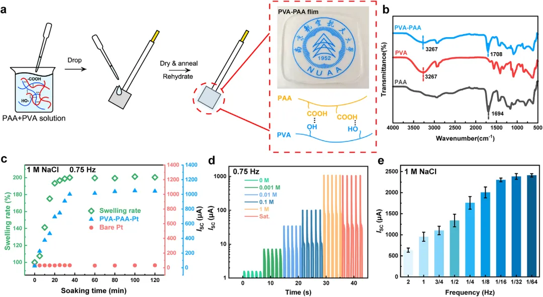 图2、高电流输出的构型设计。 (a) 在Pt箔上涂覆聚乙烯醇(PVA)/聚丙烯酸(PAA)水凝胶薄膜的示意图;(b) 傅里叶变换红外光谱证实PVA和PAA的成功复合;(c) 与裸Pt电极相比,PVA-PAA-Pt电极随浸泡时间增加再水化后输出电流的增强;(d) NaCl浓度对输出电流的影响;(e) 工作频率与输出电流的相关性。