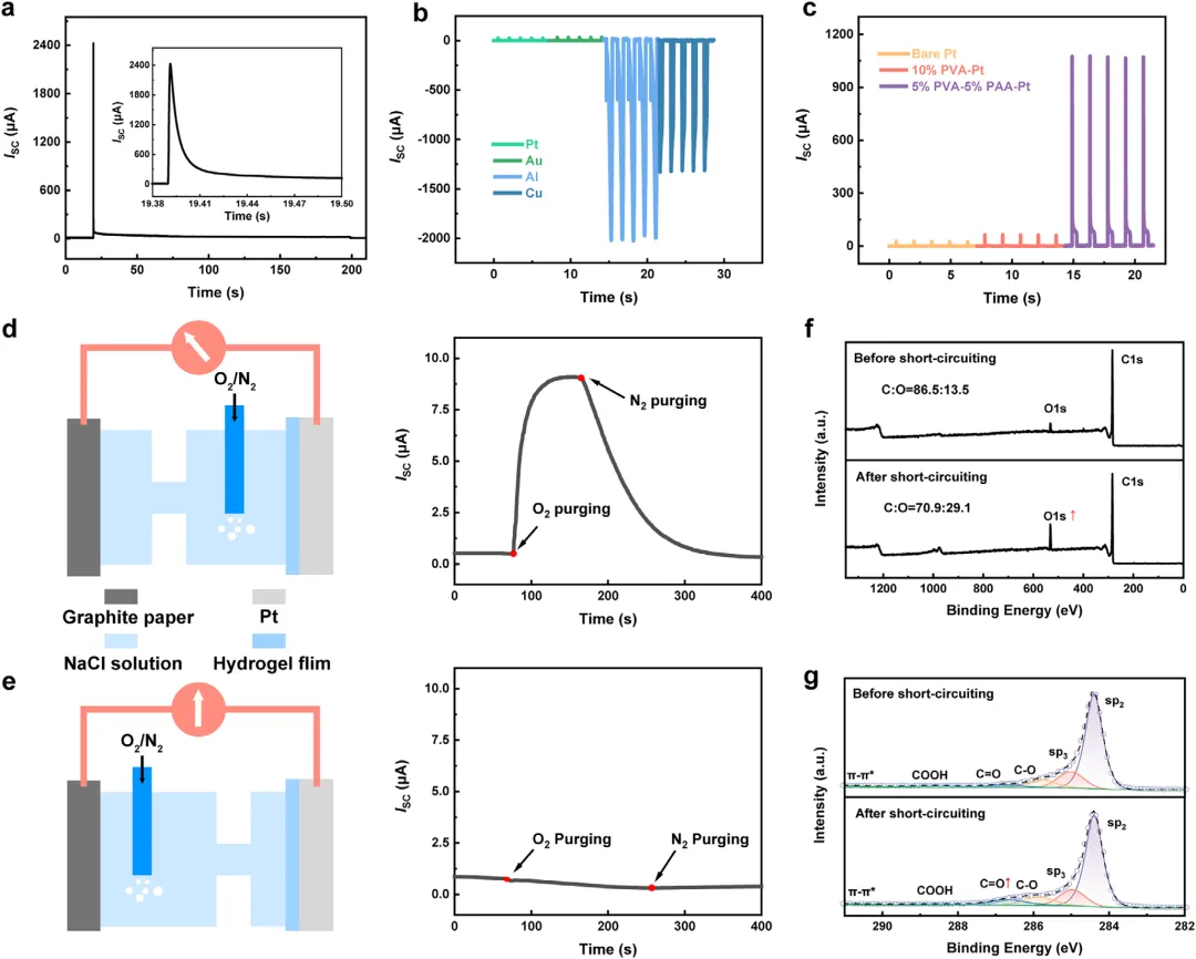 图3、化学过程。(a) 将石墨纸电极和PVA-PAA-Pt电极浸入NaCl溶液(1 M)中的长期电流曲线,插图为脉冲处的放大电流曲线;(b) 使用Pt电极或其他金属电极作为动态电极时输出电流的变化;(c) 有和没有水凝胶涂层的Pt电极的输出电流变化;(d, e) 分别在PVA-PAA-Pt电极附近(d)和石墨纸电极附近(e)交替进行O₂/N₂吹扫时的长期短路电流响应;(f) 短路操作前后石墨纸的XPS全谱;(g) 高分辨XPS碳谱显示短路后氧化碳物种的增加。