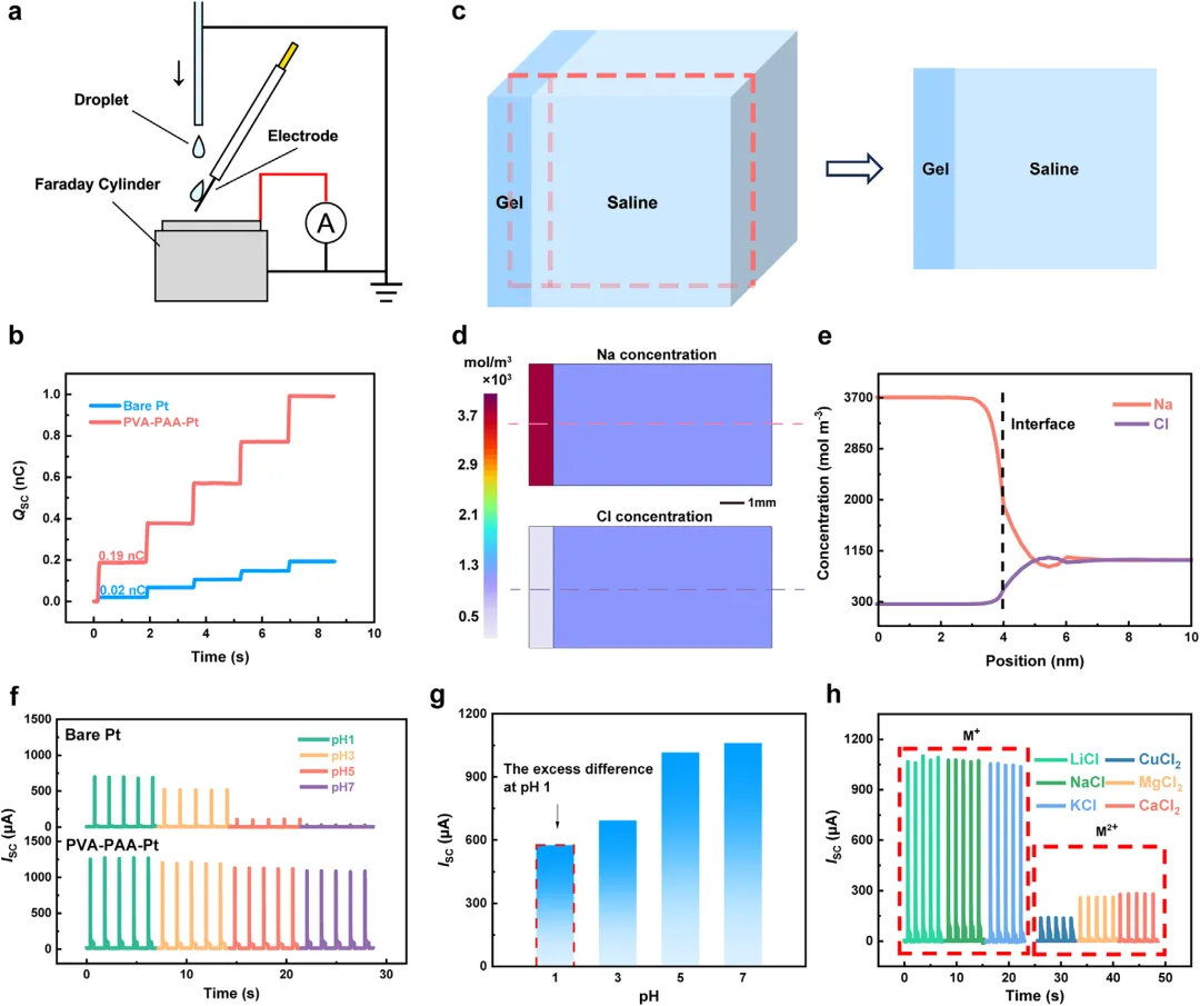 图4、物理过程。(a) 测量液滴沿电极表面滑落后电荷的装置示意图;(b) 沿PVA-PAA-Pt电极滑落的液滴比裸Pt电极表现出更高的转移电荷;(c) 水凝胶/溶液界面的二维模型示意图;(d) 计算得到的水凝胶本体和溶液中的Na⁺和Cl⁻浓度;(e) 水凝胶与溶液界面区域的离子分布;(f) 裸Pt和PVA-PAA-Pt电极在不同pH值溶液中的输出电流;(g) 水凝胶薄膜涂层贡献的输出电流增强,通过在每个pH值下从PVA-PAA-Pt电极的电流中减去裸Pt电极的电流获得;(h) 不同盐溶液中输出电流的变化。