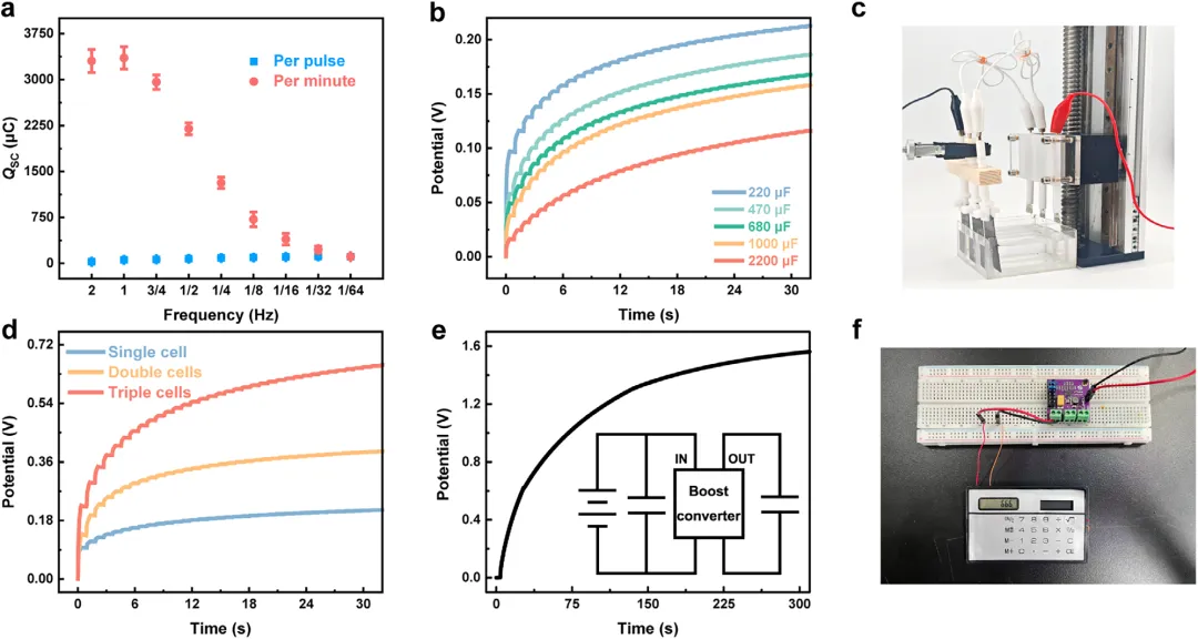 图5、HHDs的充电性能。 (a) 每次脉冲的转移电荷和每分钟累积电荷的频率依赖性;(b) 单个HHD驱动不同电容电容器的充电曲线;(c) 安装在机械执行器上用于连续操作的组装HHD模块照片;(d) 使用一个、两个和三个串联HHD电池对电容器(220 μF)的充电曲线;(e) 带升压转换器的存储电容器两端累积的输出电压;(f) 升压HHD输出驱动商用计算器的演示。