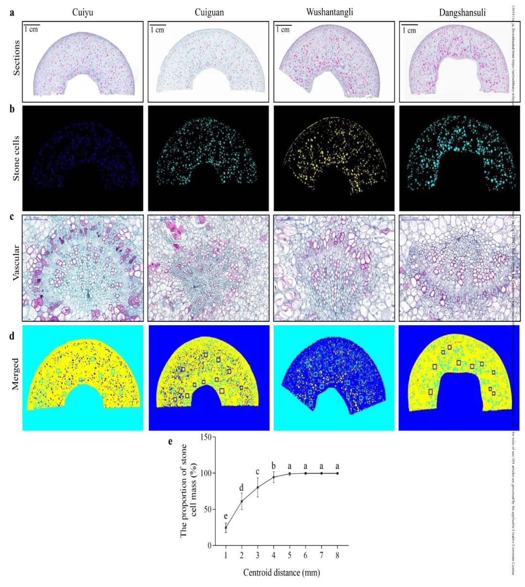 果核附近的石细胞在很大程度上决定了果实的品质。我们之前的研究发现,“金盖酥”和“幸水”果实的核细胞分布不均匀,靠近果核的核细胞密度高于其他部位。在另外30个梨品种中同样观察到这种分布模式。在这项研究中,我们调查了100个梨品种的石细胞分布,并证实了之前的发现。在一些草本植物中,石细胞分布在维管束附近。维管束可为石细胞的形成提供资源,包括各种营养物质、蔗糖、蛋白质、氨基酸、维生素和激素。在这里,我们证明了梨果实中的石细胞也分布在靠近果核的维管束。