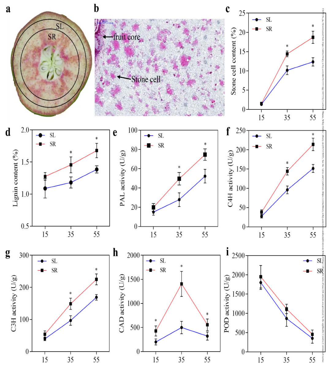 (a)“翠玉”、“翠冠”、“武山糖梨”和“砀山酥梨”(DS)的红绿染色。石细胞被染成红色。比例尺= 1cm。(b)使用MATLABR2016A软件,通过高斯滤波去噪和标记聚类来分割标记为点的石细胞。(c)维管束的红色-绿色染色。(d)标记为矩形正方形的维管束的RGB颜色空间转换。(e)维管束周围不同距离的石细胞数占100个品种石细胞总数的平均比率,并进行了多重比较。数据表示为重复样品的平均值±标准偏差 不同字母表示样本间具有显著性差异(P<0.05)。为了进一步从生理层面表征石细胞的分布模式,我们通过比较富含石细胞的部分(SR)和缺乏石细胞的部分(SL),详细分析了DS品种的果实(图2a)。如图2b所示,从核向外,石细胞分布逐渐稀疏。石细胞含量从15 DAF到55 DAF迅速增加,在15 DAF时,SL和SR之间没有观察到显著差异(图2c)。而在35和55 DAF时,SR的石细胞含量分别比SL高4.25%和6.36%。在35和55 DAF时,SR的总木质素含量分别比SL高0.27%和0.29%(图2d)。此外,木质素生物合成相关酶分析显示,在55 DAF时,SR中PAL(42.73%)、C4H(41.07%)和香豆酸3-羟基化酶(C3H)(33.19%)的活性均显著高于SL(图2e-g)。SR中CAD活性也较高,在35 DAF时达到最高水平,随后下降(图2h)。但是POD活性从15 DAF到55 DAF显著下降,而SL和SR之间没有显著差异(图2i)。结果表明,果核附近木质素生物合成相关酶活性较高。