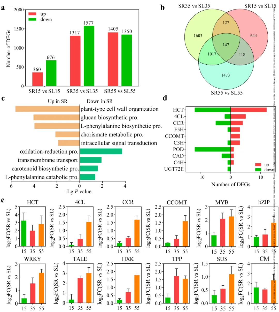 (a,b)在55 DAF下梨果实的红绿染色。SR表示石细胞丰富的部分,SL表示石细胞较少的部分。红色染色表明存在石细胞。(c)石细胞定量。(d)木质素总量。在15、35和55 DAF时,梨果实中PAL (e)、C4H (f)、C3H (g)、CAD (h)和POD (i)的酶活。数据表示为重复样品的平均值±标准偏差。t检验用于确定每个阶段SR和SL之间差异的显著性(p < 0.05)。为了研究SR和SL之间的转录组差异,我们使用15、35和55 DAF的果实进行了RNA-seq分析。主成分分析(PCA)显示SR和SL之间存在显著的转录组变化(图S4a)。我们在转录组中鉴定了42098个基因,其中SR15和SL15中有1036个差异表达基因(DEGs)。有趣的是,SR和SL之间的DEGs数量在35到55 DAF时显著增加,分别为2894和2755(图3a, S5a-c)。在SR和SL三个阶段的比较中,韦恩图分析表明,35和55 DAF果实共享大量的DEGs(1164),而15 DAF果实与其他品种果实共享的DEGs要少得多,分别只有274和265(图3b)。通过交叉比较(Table