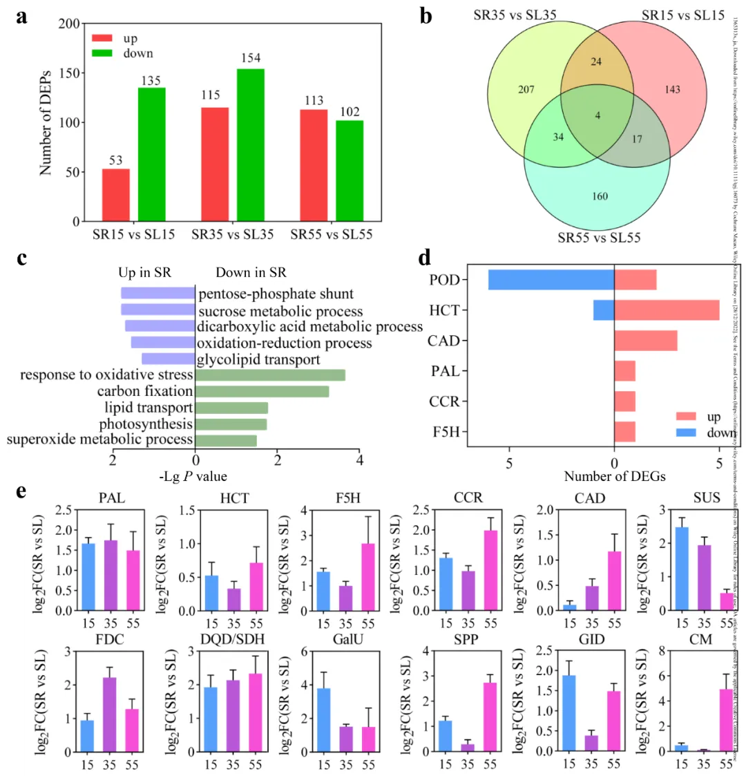 (a)DEGs的分布直方图。比较组是SR15 和SL15比较, SR35和SL35比较,SR55和SL55比较。红色表示上调的DEGs数,绿色表示下调的DEGs数。(b)通过韦恩图分析的重叠DEGs。(c)“生物过程”富集的子类别。使用单一富集分析对特定GO亚类进行分析,这些亚类包含在SR与SL中丰度一致改变的转录本。橙色代表SR中GO表达上调,绿色代表SR中GO表达下调。(d)苯丙烷生物合成。红色表示上调的基因数,绿色表示下调的基因数。(e)苯丙烷生物合成、蔗糖代谢、苯丙氨酸、酪氨酸和色氨酸生物合成中基因的相对转录水平(SR对SL)。数据表示为重复样品的平均值±标准偏差。我们进一步在15、35和55 DAF时对SL和SR的果实进行了蛋白质组学测序。PCA与转录组结果相似(图S4b)。我们在蛋白质组学中鉴定出3319个蛋白, 在SR15 和SL15比较、SR35 和SL35标胶、SR55 和 SL55比较中分别鉴定出188、269和215个差异表达蛋白(DEPs)(图4a, S6a-c)。韦恩图分析显示,各对照组中交叉的DEPs数量相似(图4b)。通过交叉比较,共鉴定出590个DEPs (Table S2)。这些结果也显示了SR和SL在35和55 DAF时的显著差异。GO富集分析显示,SR中上调的DEPs富集于戊糖-磷酸途径、蔗糖代谢和氧化还原过程(图4c),这可能参与了跨分子转运和细胞壁木质化。而SR中下调的DEPs在碳固定和光合过程中富集。KEGG分析显示,SR中上调的DEPs富集在苯丙氨酸等次生代谢产物生物合成物中(图S6d)。与转录组的数据一致,木质素生物合成中有20个DEPs蛋白在SR中上调,包括HCT (Pbr013510.1)、CAD (Pbr026287.1)、PAL (Pbr008363.1)、CCR (Pbr022405.1)、F5H (Pbr022142.1) (图4de)。此外,SR中蔗糖代谢、苯丙氨酸、酪氨酸和色氨酸生物合成以及植物激素信号转导中的一些DEPs也上调,包括SUS (Pbr035996.1)、FDC (Pbr016162.1)、DQD/SDH (Pbr017091.1)、GalU (Pbr020146.2)、SPP (Pbr010299.1)、GID (Pbr015792.1)和CM (Pbr019996.1)(图4e)。蛋白质组学分析结果再次证实了果核石细胞的木质素生物合成增加。