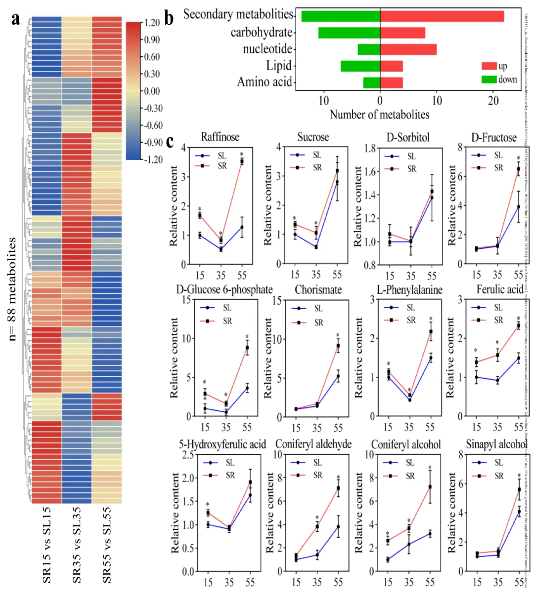 (a)DEPs的分布直方图。比较组是SR15 和SL15比较、SR35 和SL35比较、 SR55 和SL55比较。上调的DEPs数字用红色表示,下调的用绿色表示。(b)通过韦恩图分析重叠DEPs。(c)“生物过程”富集的子类别。使用单一富集分析对特定GO亚类进行分析,这些亚类包含在SR与SL中丰度一致变化的蛋白质。SR中上调的GO术语显示为紫色,下调的显示为绿色。(d)苯丙烷代谢中DEPs的数量。上调的DEPs以红色显示,下调的以绿色显示。(e)苯丙烷生物合成、蔗糖代谢、苯丙氨酸、酪氨酸、色氨酸生物合成和植物激素信号转导中蛋白质的相对丰度(SR对SL)。数据表示为重复样品的平均值±标准偏差。为了进一步研究果实发育不同阶段SL和SR中代谢物的变化,我们使用LC-MS/MS技术进行了代谢组学分析。PCA和正交偏最小二乘判别式分析法(OPLS-DA)显示,SR和SL之间许多代谢产物发生了显著变化(图S7)。共有88种代谢物在SR和SL中明显上调或下调,大多数在35和55 DAFs时相对含量较高(图5a, Table S3)。KEGG分析显示,29种代谢物为次生代谢物的生物合成产物,9种为苯丙烷生物合成产物,6种为半乳糖生物合成产物,5种为苯丙氨酸、酪氨酸和色氨酸生物合成产物,4种为淀粉和蔗糖生物合成产物(图S8a)。根据Cytoscape的研究,这些途径与次生代谢产物的代谢途径和生物合成高度相关(图S8b).此外,次生代谢产物是变化最大的一组代谢产物,SR中有22个上调,14个下调(图5b)。在55 DAF时,SR中分支酸、阿魏酸、5-羟基阿魏酸、松柏醛、松柏醇和芥子醇的相关含量显著高于SL(图5c)。这些化合物之前已被证明参与木质素生物合成。氨基酸(SR中上调4个,下调3个)和碳水化合物(SR中上调8个,下调11个)的数量也发生了变化(图5b)。在55 DAF时,SR中棉子糖、蔗糖、D-果糖和D-葡萄糖6-磷酸的相对含量显著高于SL(图5c)。然而,在SL和SR之间,没有观察到D-山梨醇含量的显著变化(图5c)。这些化合物有可能为SCW的形成提供底物。与此相一致的是,在梨果实发育过程中,SR中检测到的苯丙氨酸含量明显更高(图5c),它是许多酚类化合物的主要前体,包括木质素单体。代谢组学证明核细胞的木质化主要发生在果核附近。