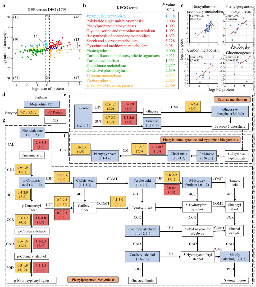 (a)LC-MS/MS分析检测到的代谢物的热图。每列分别代表在15、35和55 DSF时SR和SL之间的比较。(b)次生代谢、碳水化合物、核苷酸、脂类和氨基酸中不同代谢物的数量。红色表示上调的代谢物数量,绿色表示下调的代谢物数量。(c)苯丙烷生物合成、蔗糖代谢、苯丙氨酸、酪氨酸和色氨酸生物合成中代谢物的相对含量。数据表示为重复样品的平均值±标准偏差。t检验用于确定每个阶段SR和SL之间差异的显著性(p < 0.05)。我们整合了转录组学和蛋白质组学分析获得的信息,通过比较55 DAF与差异表达倍数来识别筛选石细胞形成的关键基因和蛋白质。我们首先从DEGs和DEPs分析中鉴定出179个基因/蛋白,其中177个(98.88%)显示至少1.2倍的变化(图6a, Table S4)。然后根据关系的散点图将这些基因/蛋白质分为9个部分(图6a)。其中,121个DEPs(67.6%)与其表达水平呈显著相关,表明在石细胞形成过程中DEPs的变化主要取决于DEGs的转录水平。值得注意的是,SR中DEGs和DEPs同时上调的基因(红色部分)主要涉及苯丙氨酸和其他次生代谢生物合成。然而,SR中DEGs和DEPs同时下调的基因(绿色部分)参与了光合作用、碳代谢和谷胱甘肽代谢(图6b)。在糖酵解/糖异生中,少数基因表现出相反的模式,即在DEGs中下调,在DEPs中上调(橙色部分),这可能是转录后或翻译后的调控。总的来说,在35和55 DAF时,许多在DEGs和DEPs分析中显示出正相关的基因参与了次生代谢产物的生物合成、苯丙类生物合成、碳代谢和糖酵解/糖异生(图6c, S9)。这些结果可能为促进果实核附近SCWs的木质化研究提供了关键证据。