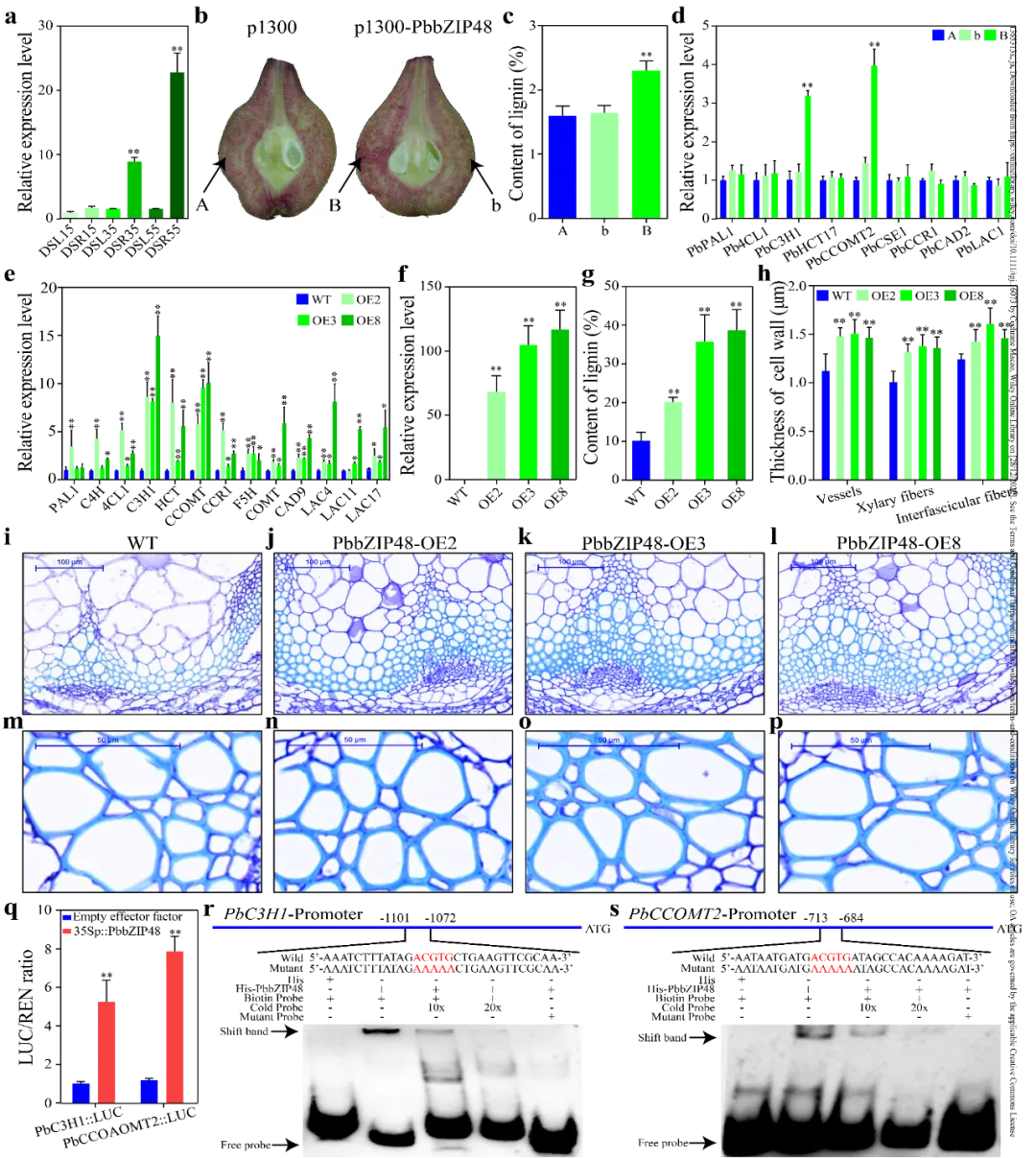 图7. PbbZIP48上调木质素生物合成基因表达,促进细胞壁木质化(PbbZIP48在果实发育过程中的相对表达量。(b)在55 DAF处对DS中PbbZIP48过表达的瞬时分析。注射部位标记为A和B,相应的未注射部位标记为B。在农杆菌浸润后7天图像。(c)在果实中注射点和非注射点周围的肉质组织中测量木质素。(d)在注射点和非注射点周围的肉质组织中木质素生物合成基因的表达。(e)过表达PbbZIP48的拟南芥中木质素生物合成基因的相对表达量。OE2、OE3和OE8表示三个独立的转基因品系。(f)过表达株系中PbbZIP48的相对表达水平。(g)茎中总木质素的测量。(h)8周时,野生型和转基因拟南芥植物的导管、木素纤维和维管纤维细胞壁厚度的定量分析。(i-p)茎横切面的甲苯胺蓝染色显示野生型拟南芥和PbbZIP48-OE3系的木质部组织。(i-l)比例尺:100μm;(m-p)比例尺:50μm;(q)LUC的定量分析。35S:PbbZIP48用作效应子,PbC3H1和PbCCOMT2启动子驱动LUC作为报告基因。(r,s)His-PbbZIP48重组蛋白结合含有G-box motif的PbC3H1 (r)和PbCCOMT2 (s)启动子区域。5’-Fam标记的寡核苷酸(ACGTG)为生物探针。相同但未标记的DNA片段(冷探针)用作竞争探针,AAAAA用作检测中阴性对照(突变探针)。数据表示为重复样品的平均值±标准偏差(*p < 0.05,**p < 0.01)。由于在梨中难以获得稳定的转基因植株,我们研究了PbbZIP48在拟南芥中的功能。与野生型(WT)植物相比,三个独立的转基因株系的根和茎的生长都有所增加(图S13, S14)。在PbbZIP48过表达的植株中,木质素生物合成基因在茎中的表达均显著上调(图7e, f)。木质素含量显著增加,OE8中最高,高达38.68%,如(图7g)所示。此外,解剖分析显示,过表达PbbZIP48植株茎部木质部发育发生明显变化,其中导管(VEs)、木素纤维(XFs)和维管纤维(IFs)次生细胞壁变厚,分别增加32.34%、34.14%和37.55%(图7i-p)。这些结果表明,PbbZIP48在拟南芥茎中SCWs的木质化中起着重要作用。为了验证PbbZIP48是否可以直接调控PbC3H1和PbCCOMT2转录本,我们首先在PbC3H1编码区上游-1085 bp和PbCCOMT2的-699 bp发现了G-box motif (5'-ACGTG-3'),它们是bZIP TF的潜在结合位点。然后,我们使用35S: PbbZIP48作为效应器,PbC3H1和PbCCOMT2的启动子作为报告子进行双荧光素酶检测(图S15)。PbbZIP48显著激活了两种启动子的相对LUC活性(图7q)。此外,使用电泳迁移率转移试验(EMSA)来确定His-PbbZIP48重组蛋白与含有来自PbC3H1和PbCCOMT2启动子区域的G-box motif的DNA探针的物理结合(图7r, s)。当PbC3H1和PbCCOMT2启动子与His蛋白孵育时,没有发现转移。当His-PbbZIP48蛋白与探针反应时,His-PbbZIP48蛋白可以结合PbC3H1和PbCCOMT2启动子中含有G-box (AC GTG)基序的标记探针,并引起迁移率的变化。此外,加入逐渐增加浓度的冷探针有效地减少了标记探针与His-PbbZIP48蛋白的结合,PbbZIP48蛋白不能与突变探针(AAAAA)结合。这些结果表明PbbZIP48能够通过G-box (ACGTG)基序直接特异性结合PbC3H1和PbCCOMT2的启动子。总之,PbbZIP48可以通过与PbC3H1和PbCCOMT2启动子区域的G-box (ACGTG)基序结合,直接上调PbC3H1和PbCCOMT2的表达。木质化是形成石细胞的基本条件。在本研究中,我们同表型、转录组、蛋白质组、代谢组等综合分析了梨果核附近,为多组学研究提供了可靠的生信分析。
