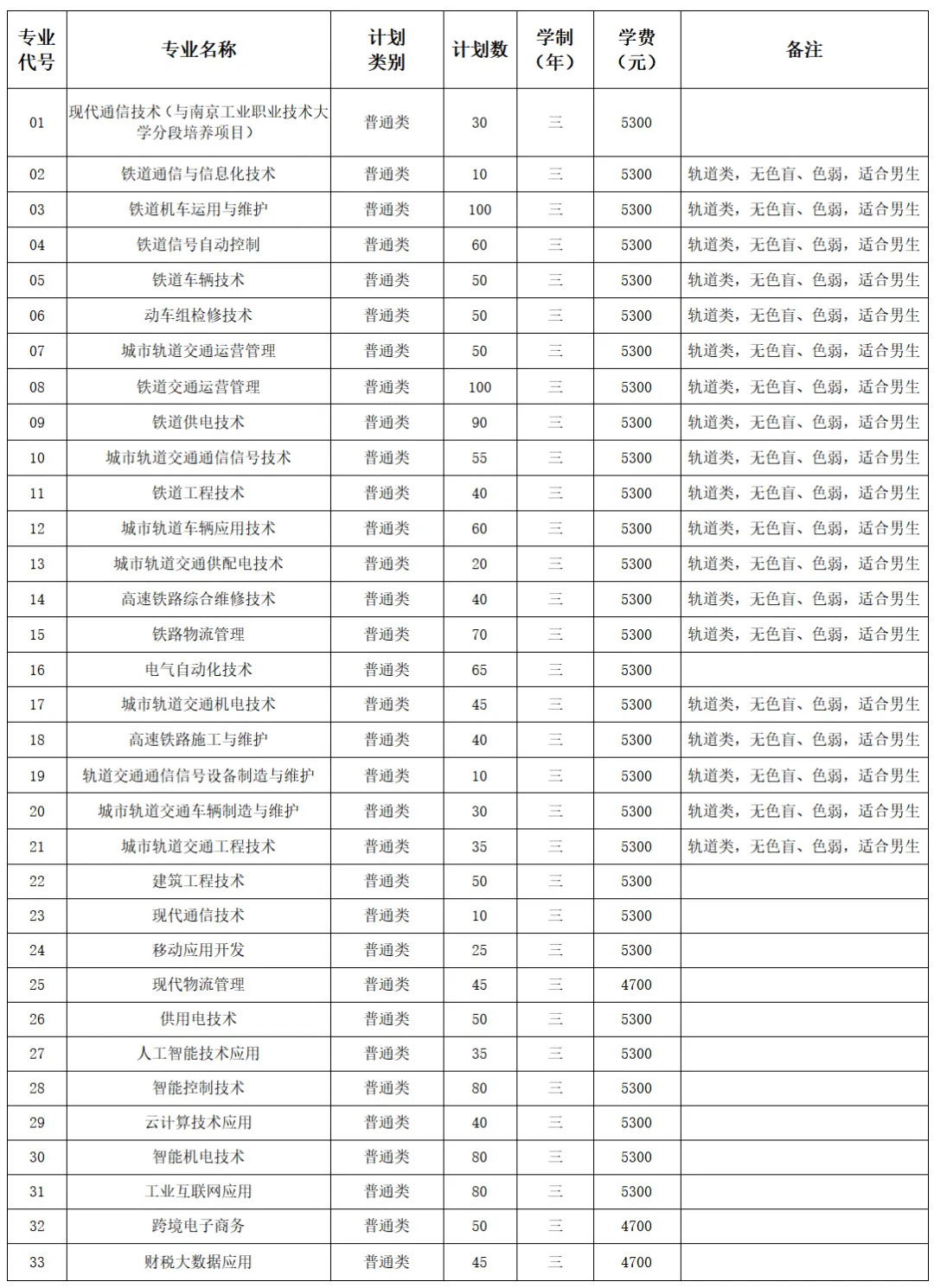 (三)铁道工程技术、高速铁路施工与维护、铁道机车运用与维护、铁道车辆技术、铁道供电技术、动车组检修技术、高速铁路综合维修技术、铁道信号自动控制、铁道通信与信息化技术、铁道交通运营管理、城市轨道交通工程技术、城市轨道车辆应用技术、城市轨道交通机电技术、城市轨道交通通信信号技术、城市轨道交通供配电技术、城市轨道交通运营管理专业色盲考生不予录取,色弱考生谨慎报考;城市轨道交通车辆制造与维护、轨道交通通信信号设备制造与维护、铁路物流管理专业色盲色弱考生谨慎报考。