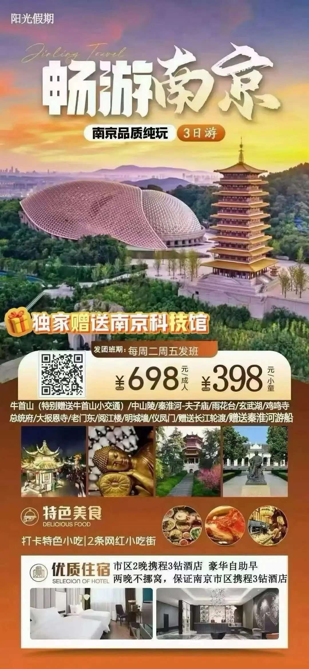 698元/人 南京纯玩3日游 牛首山·总统府·中山陵·明城墙仪凤门·科技馆.阅江楼·秦淮河夫子庙·老门东·玄武湖·鸡鸣寺·大报恩寺纯玩三日