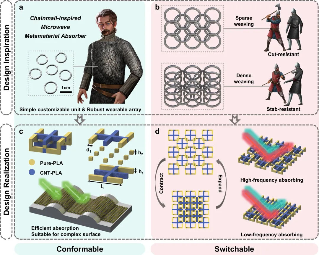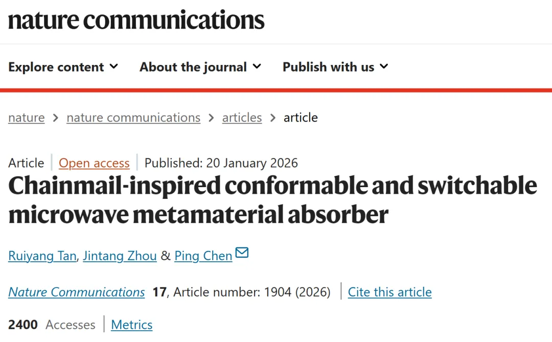 文章信息:Tan, R., Zhou, J. & Chen, P. Chainmail-inspired conformable and switchable microwave metamaterial absorber. Nat Commun 17, 1904 (2026).
