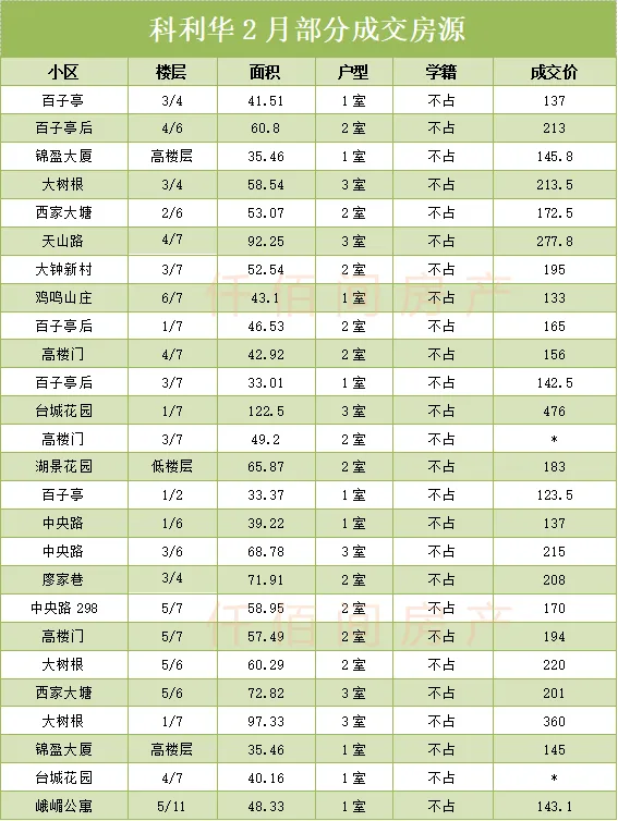 • 成交小区:拉萨路、永庆村,峨嵋岭为主,户型小、总价低更受市场青睐;