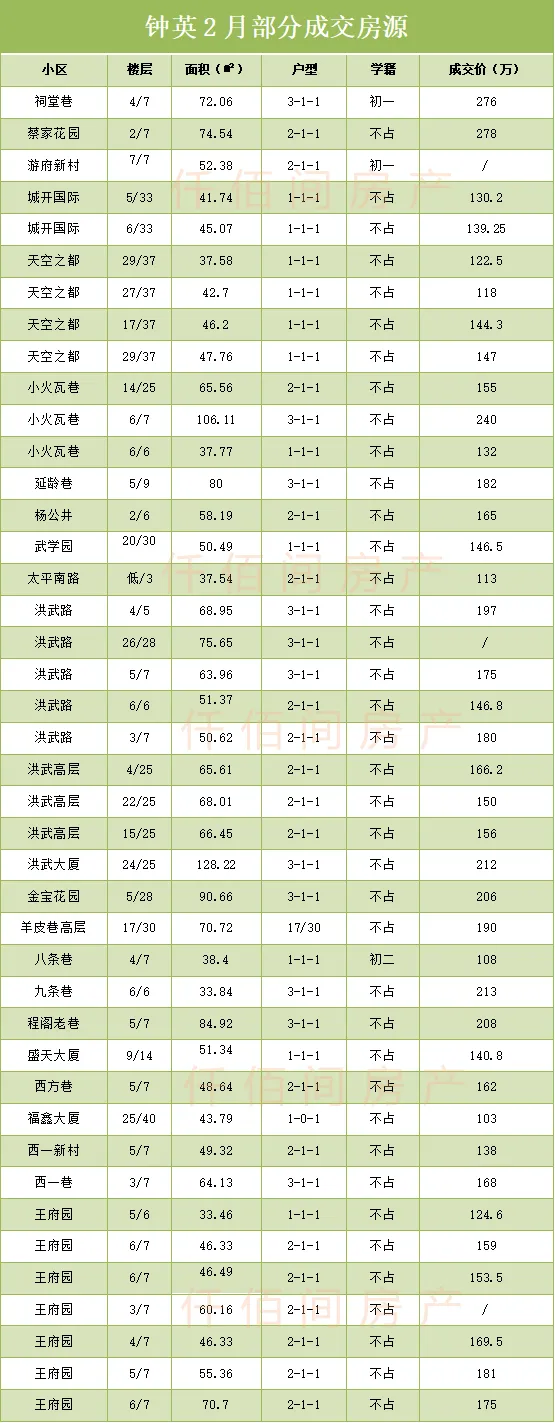 本月片区成交40套以上。2月钟英市场活跃度很高,受春节假期因素,本月工作日减半,平均日成交2套以上,主要集中在天空之都,洪武路,王府园等几个热门小区。