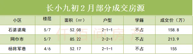 长小+九初2月成交4套左右,成交量相比上月有所下降,成交房源的议价空间保持在10%-15%之间。从成交房源的户型来看,两房仍是成交主力,成交总价在150-180万之间。相比热点的初中板块,成交热度还有一定差距,这和施教区范围小,房源量供应较少,密切相关。