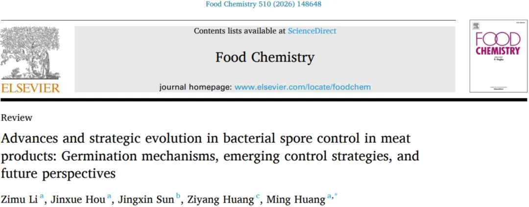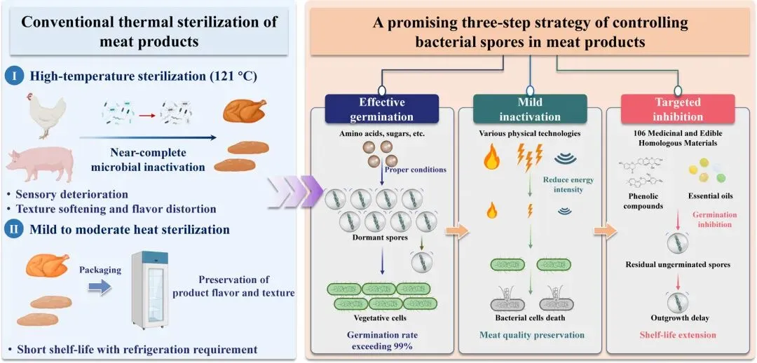 细菌孢子主要由芽孢杆菌属和梭菌属产生。由于其耐热、耐化学和耐物理处理的特殊抗性,它们对肉制品行业构成了持续的挑战。这种抗性常导致肉制品腐败和食源性疾病,而传统的热灭菌方法可能会损害产品的感官和营养品质。本文提出了一种三步控制策略,包括:有效诱导萌发、温和物理灭活以及使用药食同源来源的生物活性化合物进行靶向抑制。当前研究强调,将萌发剂与温和物理灭活技术相结合可显著增强孢子控制效果,而药食同源物质在干扰萌发途径方面显示出潜力。然而,关于孢子萌发的分子机制以及联合处理的协同效应的认识尚不充分。因此,本综述为肉制品中可持续的孢子控制提供了一种有前景的策略,为未来研究、工业应用以及开发安全、高质量的肉制品提供指导。