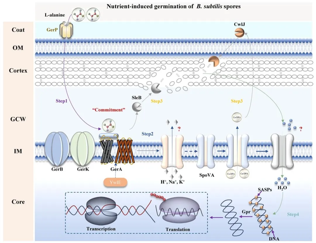 图 1 L-丙氨酸诱导的枯草芽孢杆菌孢子萌发机制。问号表示其作用机制仍不明确的分子事件。OM:外膜;GCW:胚细胞壁;IM:内膜;CLE:皮层裂解酶;SASPs:小酸溶性芽孢蛋白。