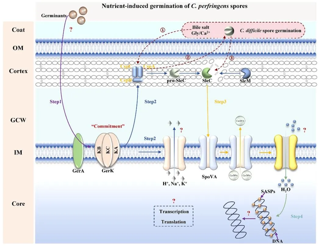 图 2 产气荚膜梭菌孢子的萌发机制。问号表示其作用机制仍不明确的分子事件。OM:外膜;GCW:胚细胞壁;IM:内膜;CLE:皮层裂解酶;SASPs:小酸溶性芽孢蛋白。
