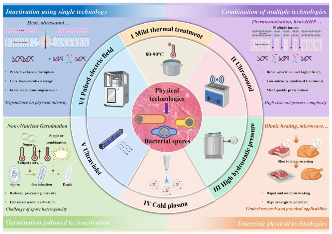 自1838年首次发现细菌孢子以来,科学研究已证实其对热、干燥、辐射和消毒剂具有极强的抵抗力,这使其成为肉制品加工和保藏中的持续性挑战。尤其是在肉制品丰富的营养和潮湿环境中,孢子极易萌发并产生毒素,导致腐败和食源性疾病。虽然传统的热灭菌方法是主要控制手段,但其高强度处理往往会对肉制品的感官和营养品质造成不可逆的损害。与此同时,肉制品加工环境中广泛存在的芽孢杆菌属和梭菌属孢子,即使在低浓度下也能在适宜条件下复苏并繁殖,给全球肉制品行业带来了巨大的经济损失和食品安全隐患。因此,亟需探索既能有效控制孢子,又能保持产品品质的新型、温和且靶向性强的综合控制策略。