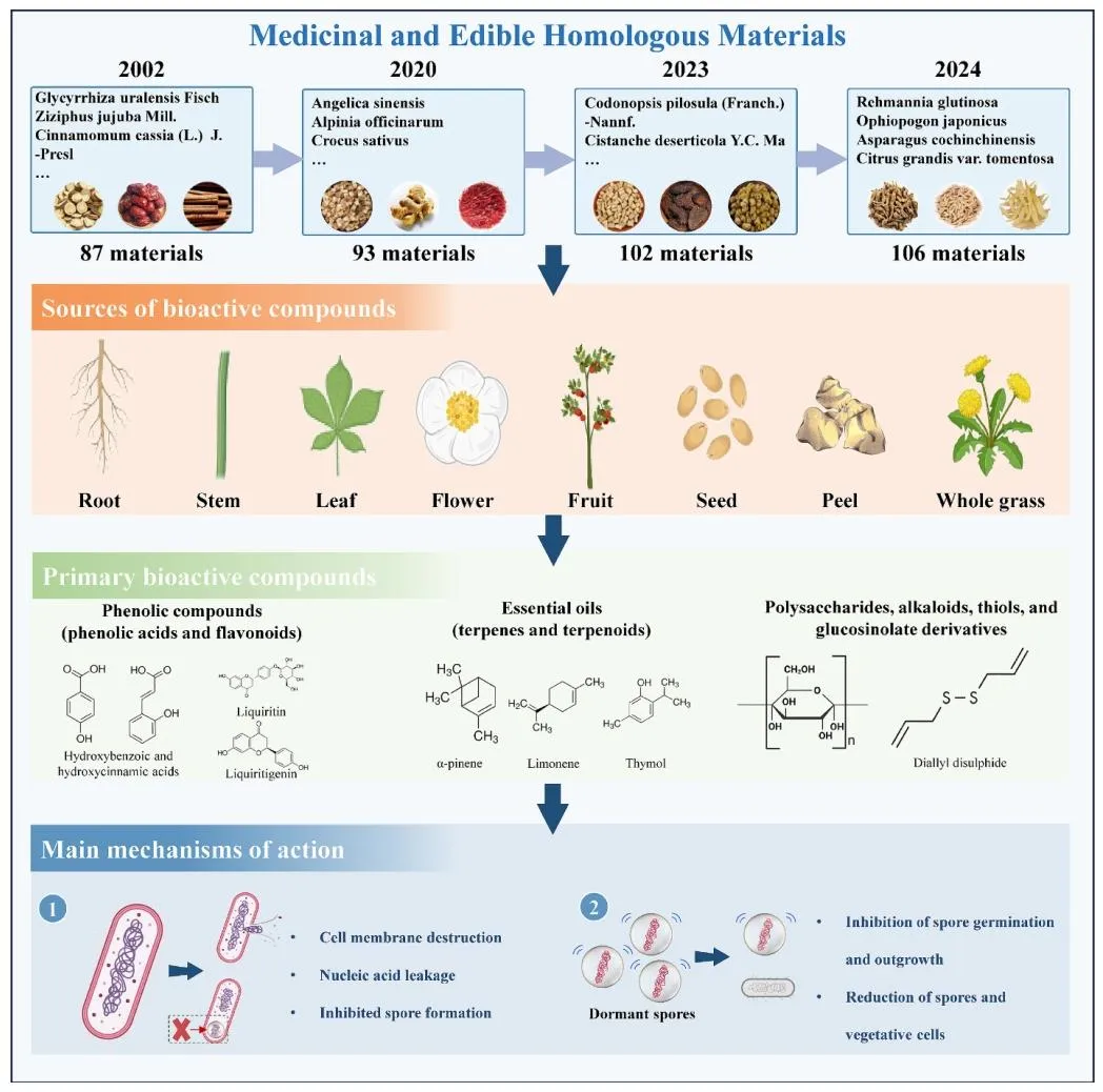 图 4 用于肉制品中靶向抑制孢子的代表性药食同源物质及其生物活性化合物。