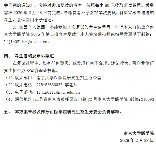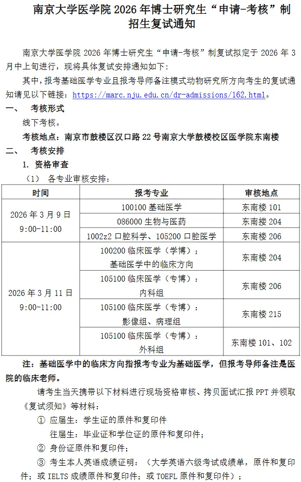 >南京大学医学院2026年博士研究生“申请-考核”制招生复试通知