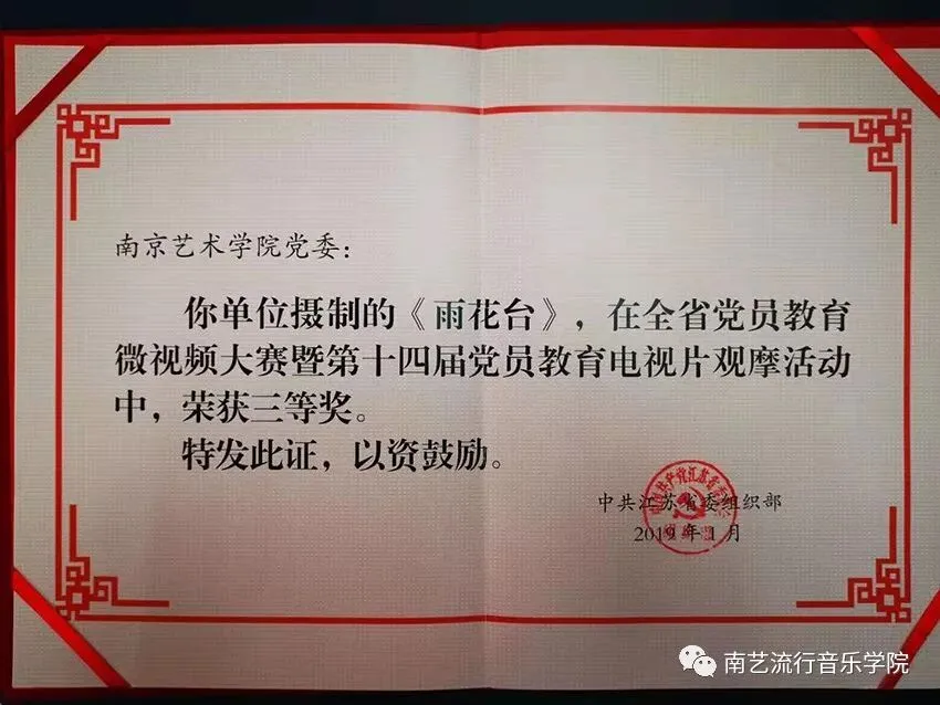 表彰大会上,流行音乐学院党总支共有6项获奖:流行音乐学院教工党支部获得先进基层党组织,冯玲获得优秀党务工作者,王佳佳、刘小凡获得优秀共产党员,教工支部“不忘初心砥砺前行育德艺双馨音乐人”和学生支部“‘调出最美声音’义务调律学雷锋活动”获得最佳党日活动。同时,由流行音乐学院选送的影像作品《雨花台》荣获江苏省委宣传部全省党员教育微视频大赛暨第十四届党员教育电视片观摩活动三等奖。校领导为受表彰的先进集体和个人颁发了奖牌和证书。