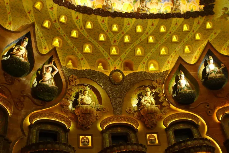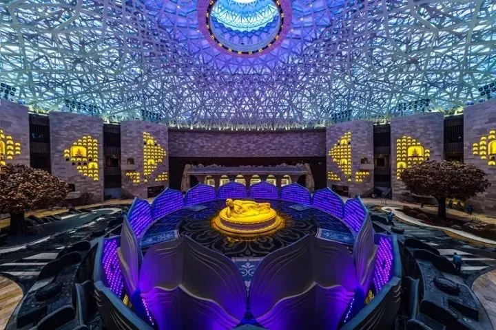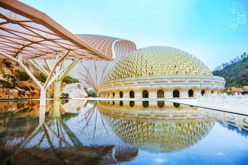 【佛顶宫】(牛首山遗址公园内最大看点要数佛顶宫了。世界唯一一颗佛顶舍利:就在牛首山佛顶宫!佛顶宫呈半圆状,整体造型是以巨型莲花托起佛顶发髻的摩尼穹顶,直径超过200米,非常辉煌壮观。在整个穹顶的最底层,整个遗址公园最为神圣的宫殿里供奉着释迦牟尼佛顶骨舍利。供奉佛祖顶骨舍利的仿制圣塔有鎏金、水晶、琉璃、宝石等佛教“七宝”镶嵌,集青铜、鎏金、掐丝珐琅、雕塑、錾刻等数十种传统工艺于一身,再辅以激光投影,堪称精美绝伦)。