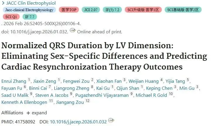 📍如今,这一谜题迎来根本性突破👇。 南京医科大学第一附属医院发表于《JACC: Clinical Electrophysiology》的多中心研究,创新性提出经左心室大小标准化的QRS时限——一个从“心脏解剖结构”穿透至“电学不同步程度”的整合评估新指标😎。