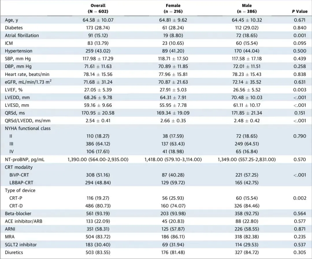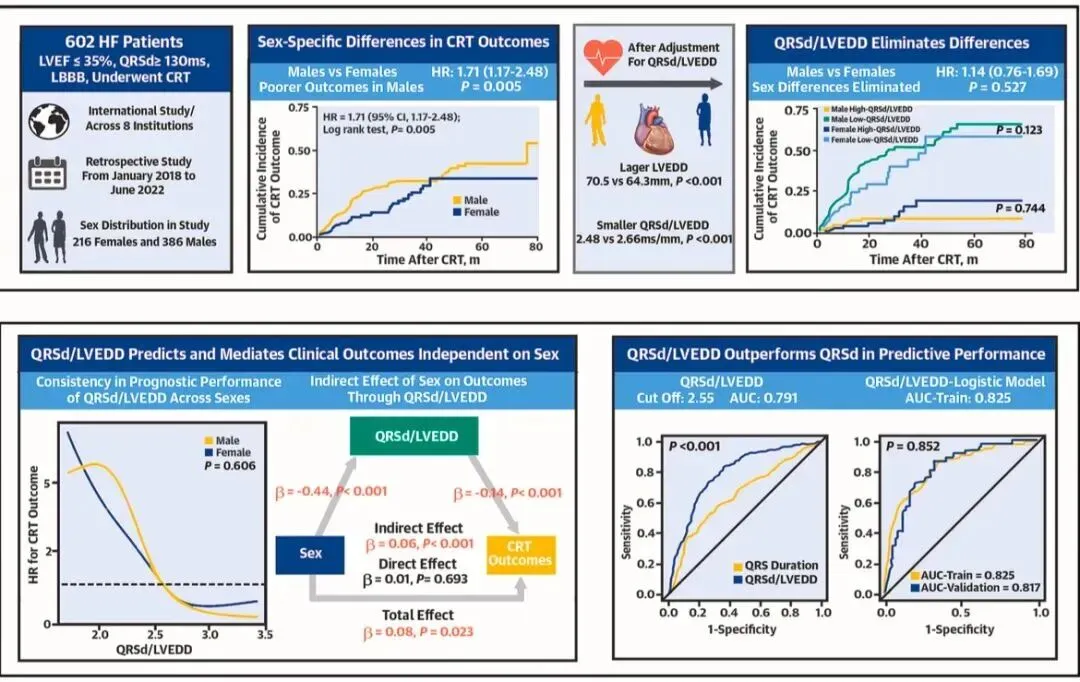 本研究首次系统证实,经左心室大小标准化的QRS时限(QRSd/LVEDD)能完全消除CRT疗效中的性别差异。女性患者的临床优势实质上是更高QRSd/LVEDD比值的体现,而非性别本身的直接效应。