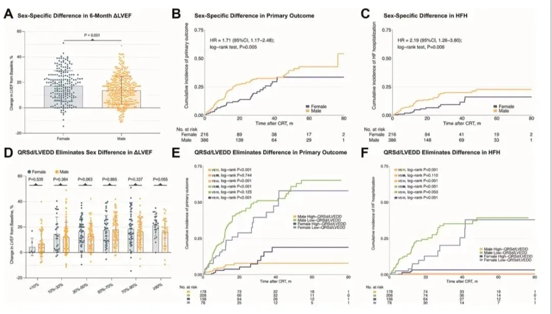 E-F:无论性别,QRSd/LVEDD 高的患者预后更好;相同 QRSd/LVEDD 水平下,男女预后无差异。