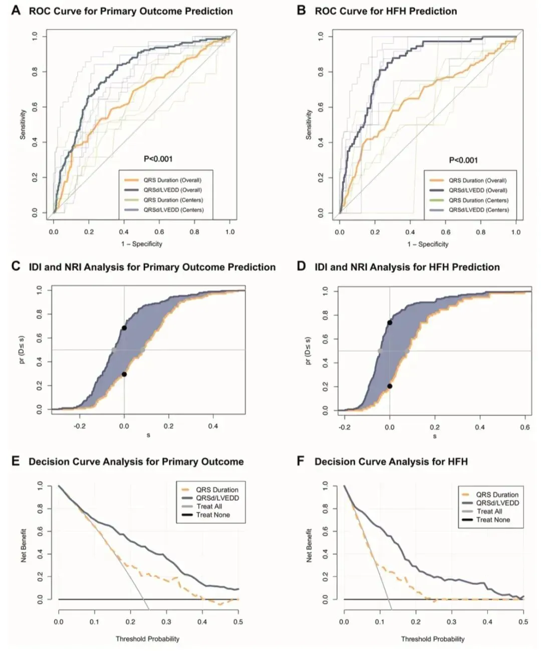 C-D:IDI 和 NRI 分析显示 QRSd/LVEDD 能更好地区分和重分类风险。