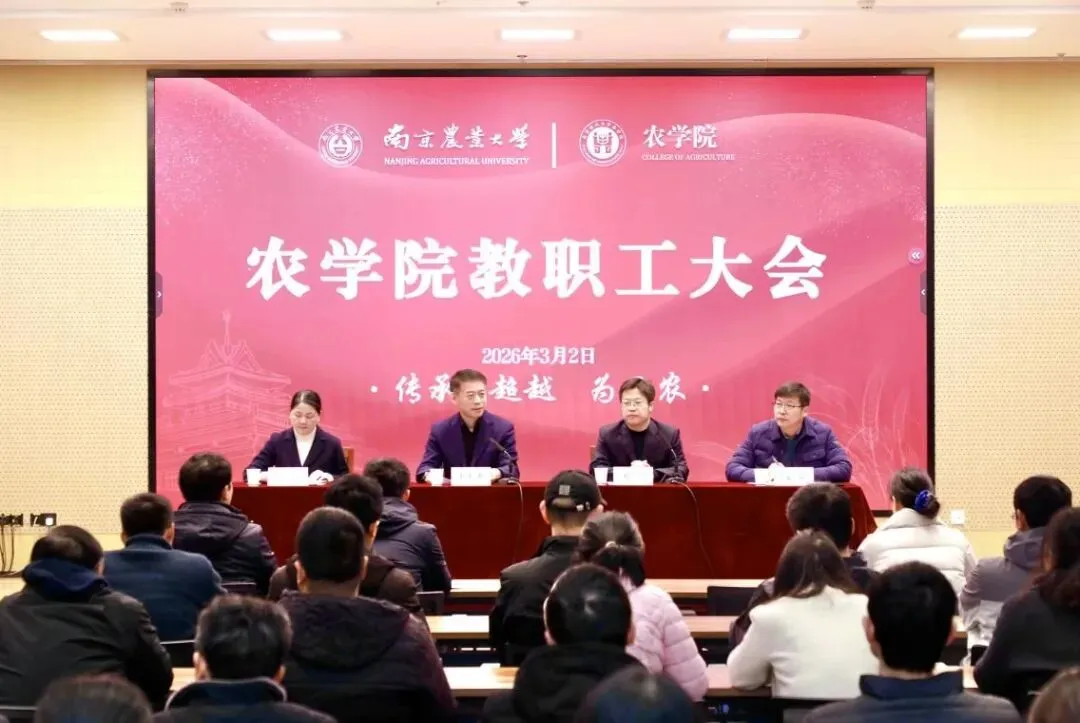 3月2日,南京农业大学农学院召开新学期教职工大会,校党委书记王春春、党委组织部部长刘亮出席会议,学院领导班子成员、全体教职工及学生代表参加会议。刘亮主持会议,并宣读了学校党委关于任命曹爱忠同志为农学院党委副书记、院长的决定。 王春春对农学院师生展现的“肯干、想干、会干、能干、实干”的精神特质予以高度评价。他要求,全院教职工要统一思想、凝聚共识,着力建设强有力的领导班子和高素质教师队伍。他强调,农学院作为学校服务强国建设的核心力量,要切实扛起发展重任,走在全校前列、做全校学院的示范、挑起学校建设农业特色世界一流大学的大梁。他指出,作物学科是农科院校的根基与灵魂,学院要重视作物学科发展,将人才培养摆在核心位置,主动拥抱人工智能等前沿技术,以科技赋能学科高质量发展,在“十五五”这一关键节点实现新突破。 曹爱忠对学校党委的信任与培养表示衷心感谢。她郑重表态,将在今后工作中做到铸牢忠诚之魂,坚守为党育人、为国育才初心使命,绝不辜负组织的重托和全院师生的信任;砥砺实干之风,聚焦粮食安全、作物育种等国家急需领域,推动学科建设与科研创新再上新台阶;厚植师生之情,用心服务师生,营造优良育人治学环境;筑牢团结之基,维护班子团结,凝聚全院发展合力。 会上,曹爱忠还向全体教职工传达了中共南京农业大学第十二届委员会第二十五次全体会议核心精神,并结合学校部署和学院实际,对学院新学期重点工作作出安排,她要求全体教职工要紧扣“双一流”建设和“十五五”规划编制任务要求,细化落实举措、层层压实责任,确保学校党委决策部署在学院落地生根、见行见效。 庄森代表学院党政班子及全体师生,对曹爱忠同志回院任职表示热烈欢迎。他表示,将全力支持曹爱忠院长开展行政工作。并就新学期重点工作提出四点要求:一是筑牢安全底线,全方位排查整治安全隐患,保障新学期教学科研工作有序开展;二是严明纪律规矩,强化师德师风与党风廉政建设,规范科研经费使用和校外兼职管理等,筑牢廉洁自律思想防线;三是提振工作作风,加大对教职工教学科研工作的支持力度,为教学科研创新营造良好环境;四是压实育人责任,加强对学生的教育引导与关心关爱,助力学生全面成长成才。 此次新学期教职工大会的召开,进一步明确了学院新学期的发展方向和工作重点,凝聚了思想共识、激发了工作干劲。面对新的发展阶段和历史使命,在校党委的坚强领导下,农学院领导班子将秉持初心、勇担使命,认真贯彻落实学校第十三次党代会的任务部署,开展好树立和践行正确政绩观学习教育,团结带领全院师生凝心聚力、真抓实干,全力推动学院事业迈上新台阶,为学校农业特色世界一流大学建设贡献农学智慧和力量。曹爱忠:教授,博士生导师,主要研究方向为小麦主要病害开展抗病资源创制、抗病基因发掘、抗病基因定位、克隆和功能鉴定