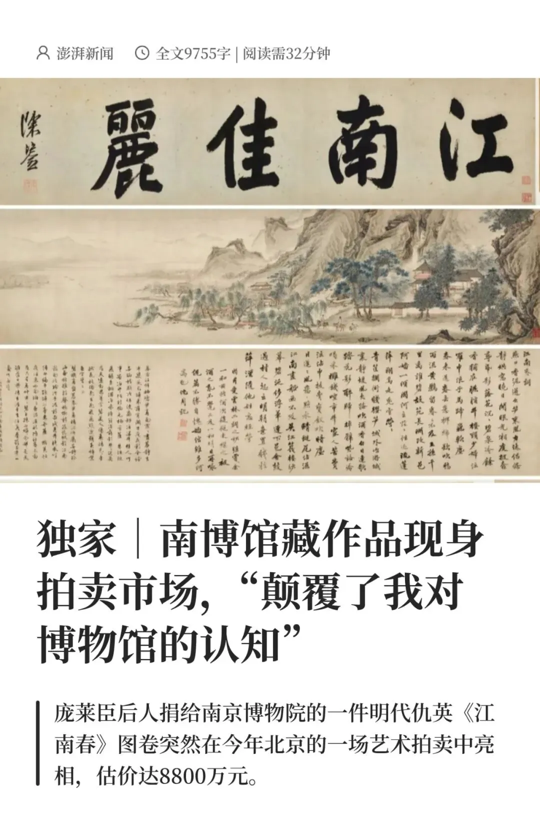 南京博物院对《江南春》图卷的处置过程,存在严重的信息不透明问题。为什么当年被认定不值钱的“假画”,几十年后能在市场上估价近亿元?
