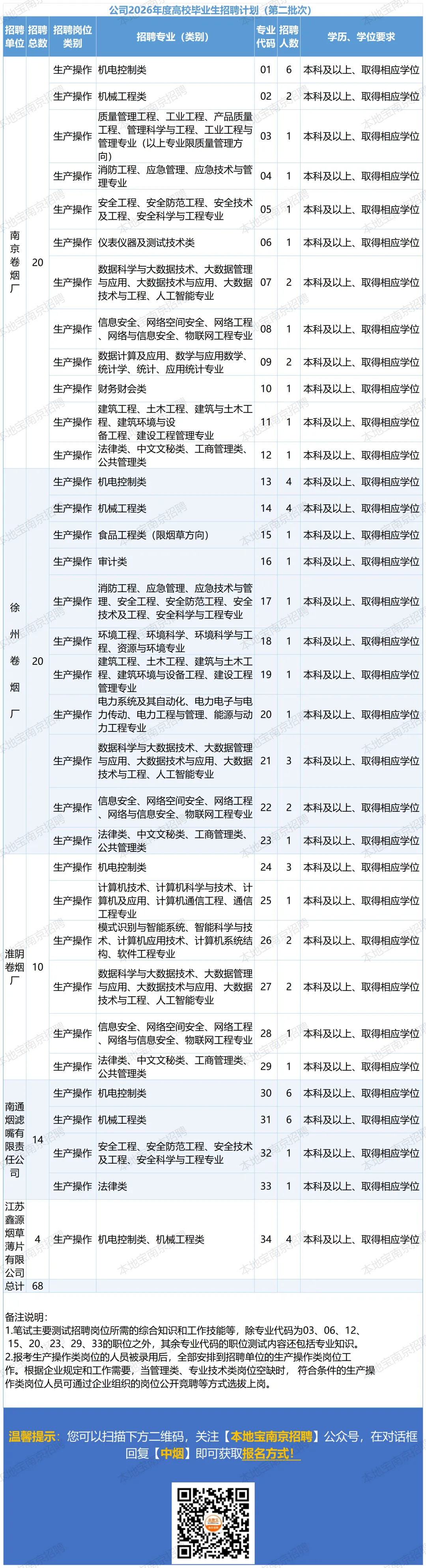 报名时间:2026年3月9日9:00至2026年3月18日17:00,逾期报名通道关闭,不再受理。目前报名通道暂未开启,大家可以关注【本地宝南京招聘】,等报名通道开启后,小编会发布信息通知大家!报名方式:您可以长按下方二维码,关注【本地宝南京招聘】公众号,回复【中烟】,即可直达报名入口!