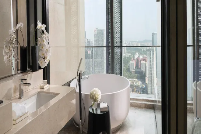 酒店共有258间客房及套房,均位于43层以上。内部装饰雅致现代,所有客房均设有步入式衣帽间、独立卫浴及梳妆台。