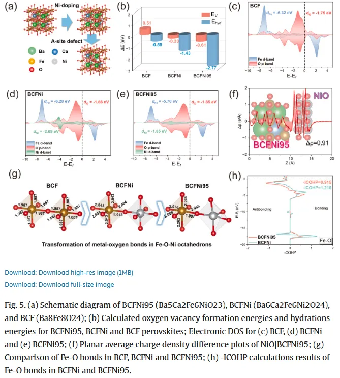 亮点二|降低氧空位与水化能工作内容:DFT计算显示BCFNi95氧空位形成能降低至−0.69 eV,水化能为−2.77 eV。研究价值:降低能垒有助于氧/质子快速迁移,提升ORR/OER反应动力学,实现电极高性能。