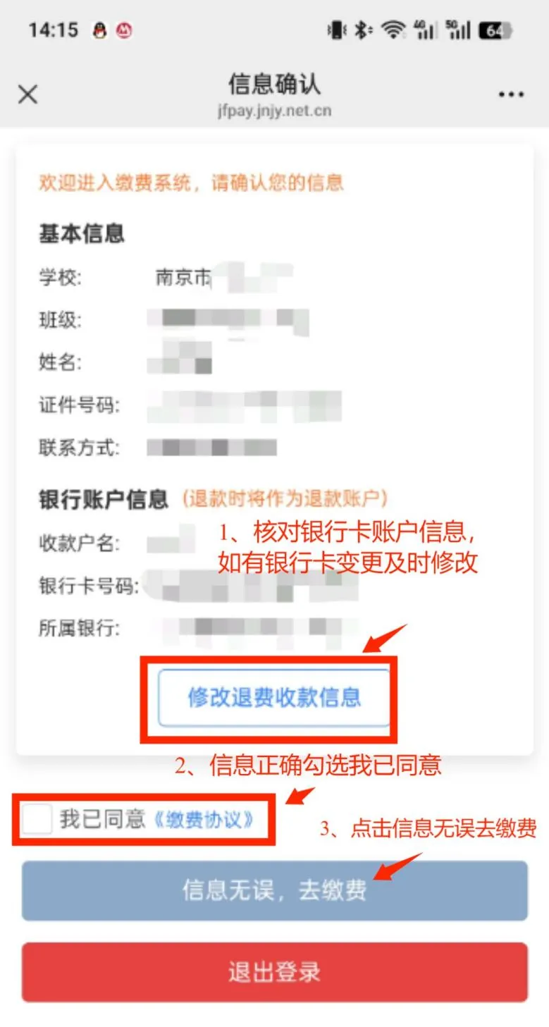 3、登录成功后,进行信息确认,核对幼儿基本信息,首次登录须绑定退款账户信息(家长在用的借记卡),填写完点击保存,此账户为后期退费账户,如银行卡账户信息有变更请家长及时更新,确保后期顺利退费,信息核对无误后勾选“我已同意《缴费协议》 ”,点击“信息无误,去缴费”。1、电脑访问「江宁教育服务平台」首页(http://www.jnjy.net.cn/),在左侧「便捷服务」区域找到「学生缴费」按钮,点击跳转登录页。