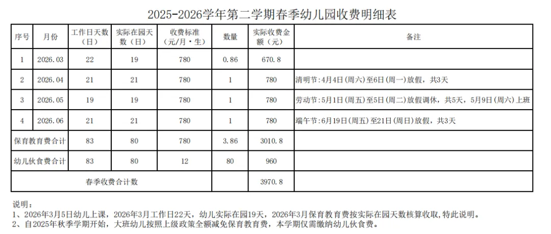 我园保育教育费收费标准为780元/生/月,伙食费收费标准为12元/生/天,自2025年秋季学期开始,大班幼儿按照上级政策全额减免保育教育费,本学期仅需缴纳幼儿伙食费。具体缴费明细如下: