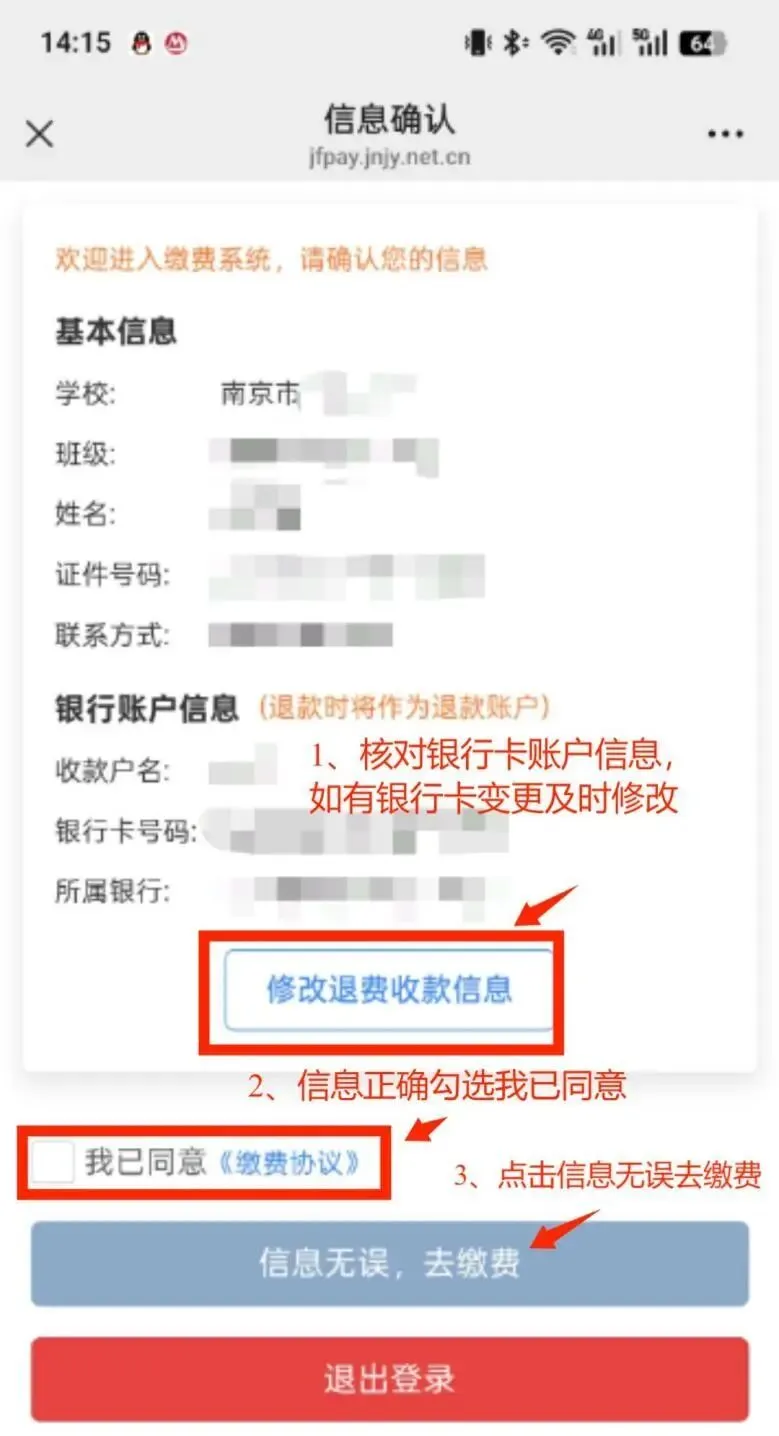 3、登录成功后,进行信息确认,核对幼儿基本信息,首次登录须绑定退款账户信息(家长在用的借记卡),填写完点击保存,此账户为后期退费账户,如银行卡账户信息有变更请家长及时更新,确保后期顺利退费,信息核对无误后勾选“我已同意《缴费协议》 ”,点击“信息无误,去缴费”。
