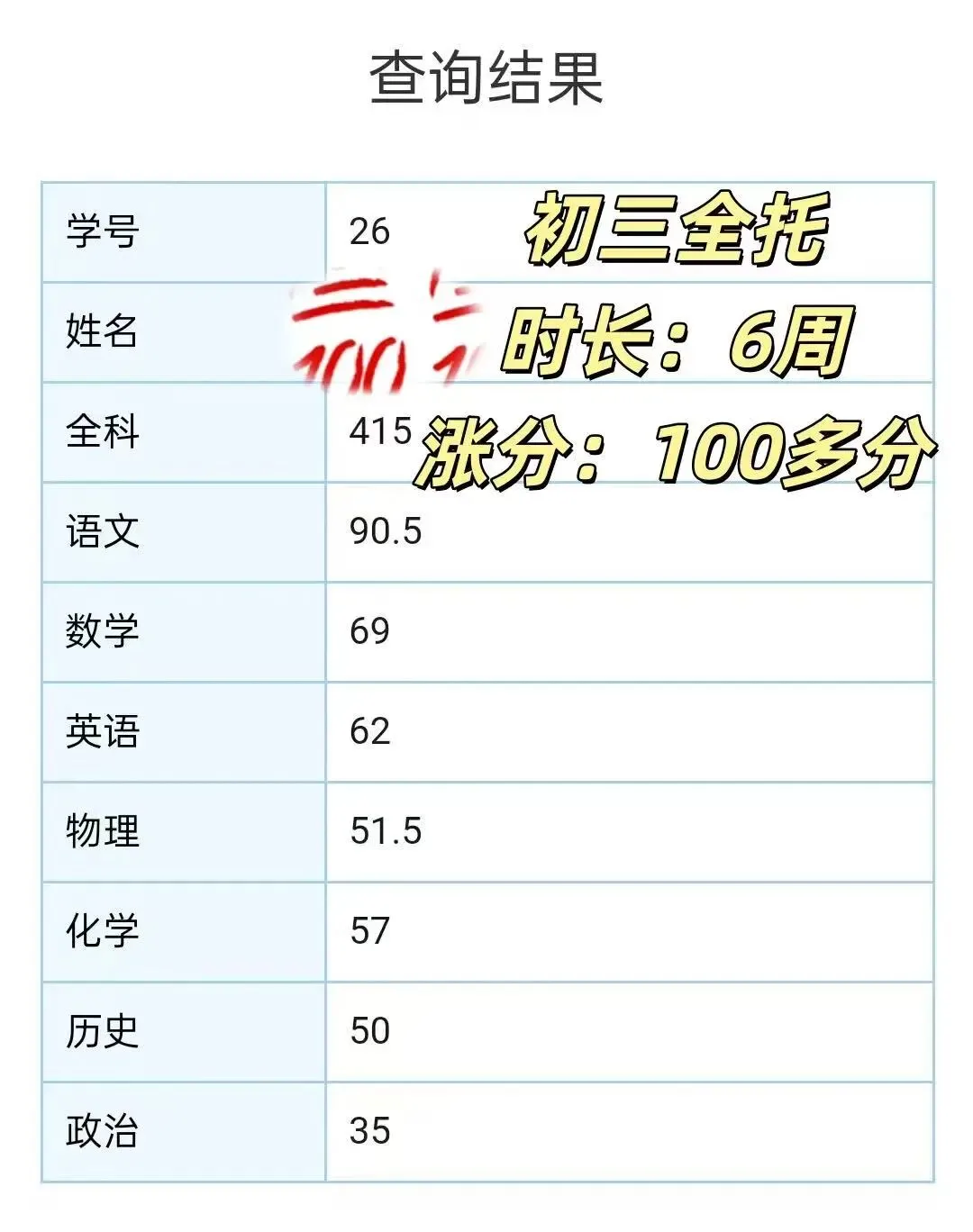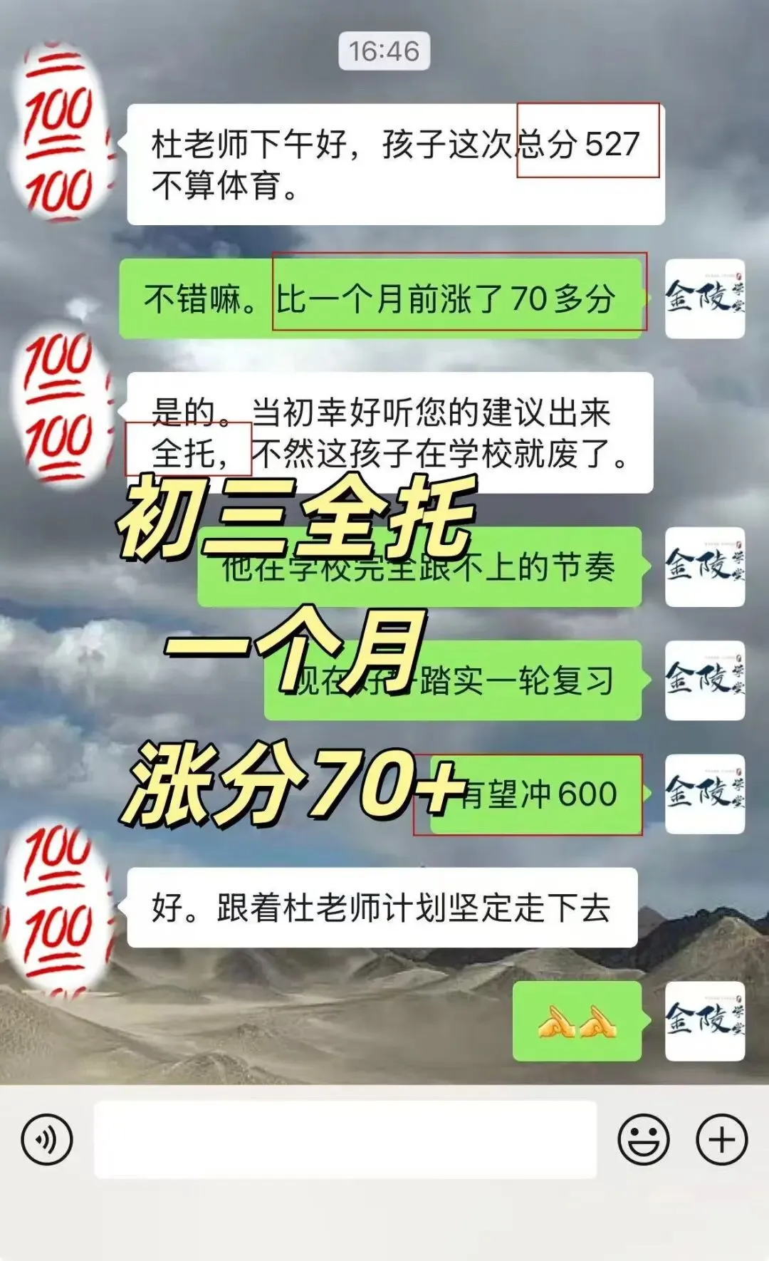 考生:李同学(初三) 入班基础:距中考仅剩四月有余,模拟考仅480分,数学成为致命短板,仅65分的成绩拖垮整体排名——二次函数大题屡屡留白,几何辅助线无从下手,两大模块每次模拟均丢分30+;自律性薄弱,居家刷题时拖延懈怠,深夜十一点仍未完成基础习题,还常偷偷刷手机分心,备考方向迷茫,越努力越焦虑,甚至萌生了放弃重点高中的念头。家长自身不懂中考考点,无力辅导,辗转多家辅导机构,却始终未见成效,满心焦灼却无计可施。 全托蜕变:(贴合价值一、二、三)入班伊始,我们便为其开展精准学情检测,量身定制专属提分方案,打破备考困境。数学老师每日抽出1小时专项辅导,深耕几何辅助线三大解题模板,拆解二次函数核心考点,每周开展2次针对性小测,错题复盘时逐题标注易错点与规范解题步骤,手把手引导其查漏补缺;班主任全程在岗,严抓作息管理,隔绝电子设备干扰,每日督促错题复盘,及时解答备考疑惑,梳理中考核心考点,优化解题思路,同时联动家长,每日反馈孩子的学习状态,让家长实时知晓成长点滴。四月深耕,终有回响,李同学的数学成绩从65分稳步攀升至80分、95分,最终稳定在108分,总分突破632分,成功叩开当地重点高中的大门,完成了从迷茫到笃定的华丽逆袭。 家长反馈:“孩子入托后的变化,我们看在眼里、喜在心里,再也不用我们催着学习,班主任每日分享学习状态,数学提分尤为明显,终于圆了孩子的重点高中梦,选择金陵学堂,是我们做过最正确的决定!”