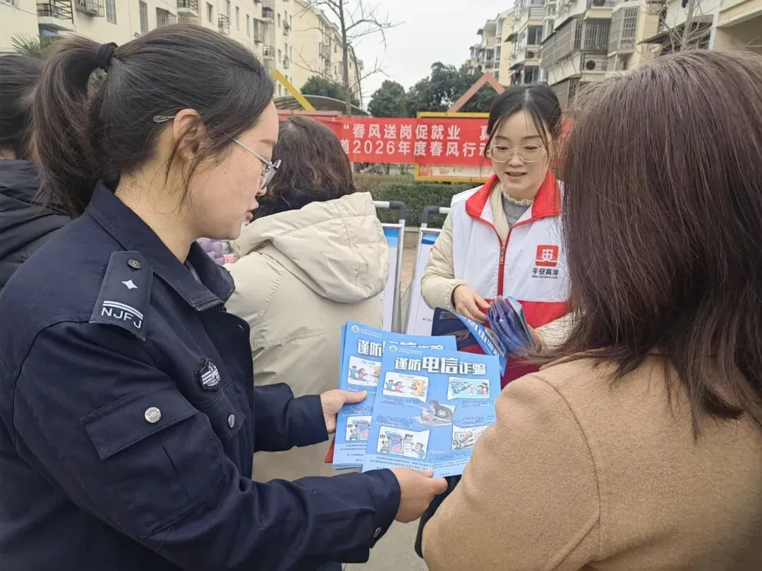 3月4日上午,南京市高淳区固城街道2026年新春招聘会现场人气十足。借此良机,街道平安办联合固城派出所,在前锦苑小区同步开展了一场重点突出的防范电信网络诈骗宣传活动,将就业服务与平安建设紧密结合,为求职者送上“安全”与“岗位”双重大礼。