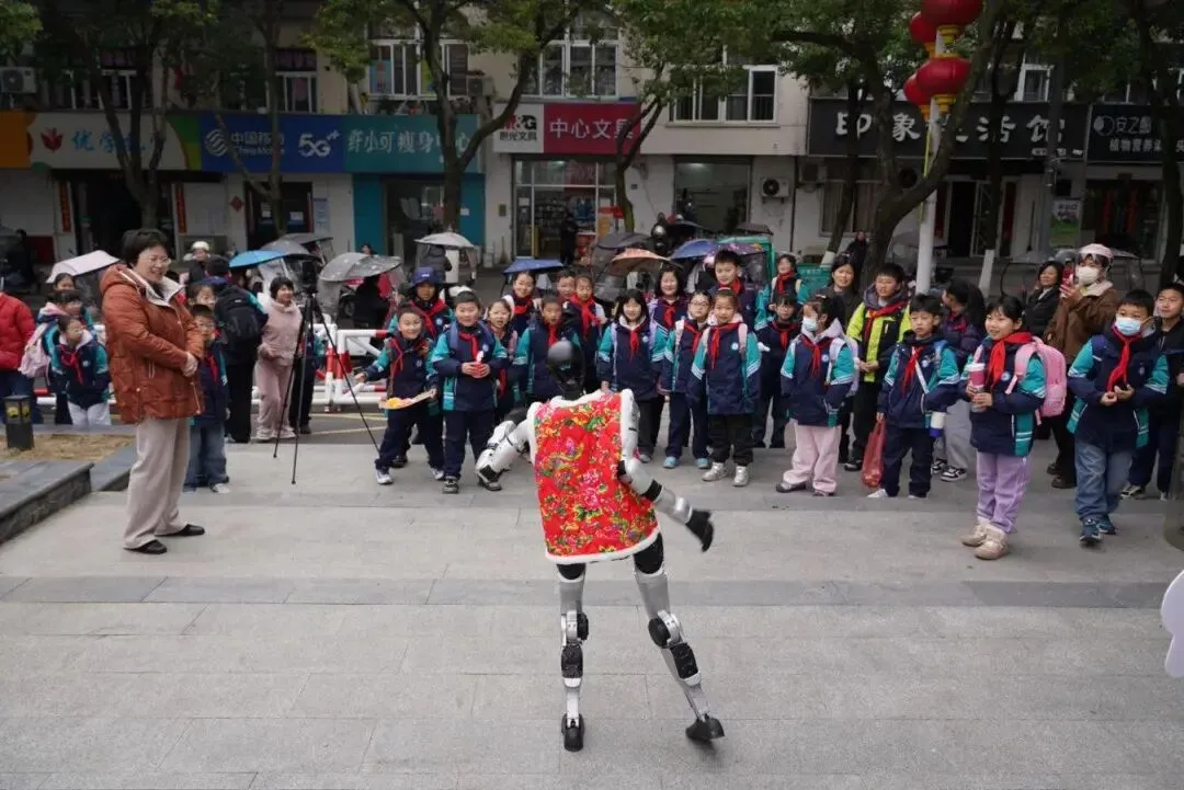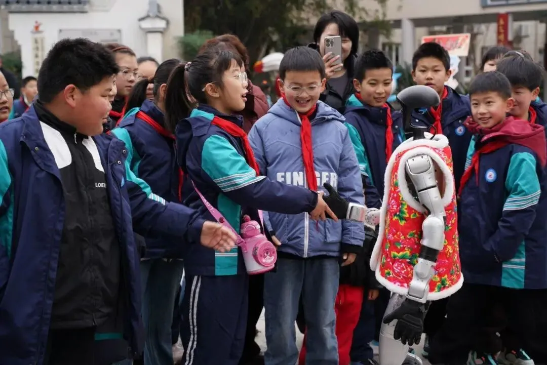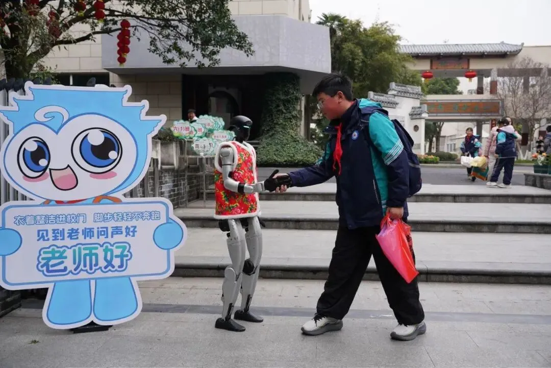 作为现场最受欢迎的“小明星”,这台机器人不仅驻守在校门口,热情欢迎每一位返校的学生,还穿梭于校园各个角落、走进班级,用灵动的舞姿传递开学的喜悦。孩子们纷纷围上前,有的与机器人合影留念,定格下开学的美好瞬间;有的大胆挑战,跟着机器人一起跳舞,脸上洋溢着纯真的笑容。