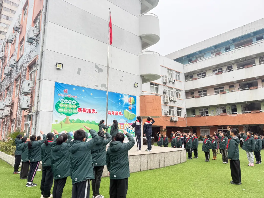 伴随着雄壮的国歌,五星红旗冉冉升起,全体师生肃立注目,少先队员行队礼。庄重的升旗仪式厚植家国情怀,激励队员们在星星火炬指引下,争做新时代好少年。
