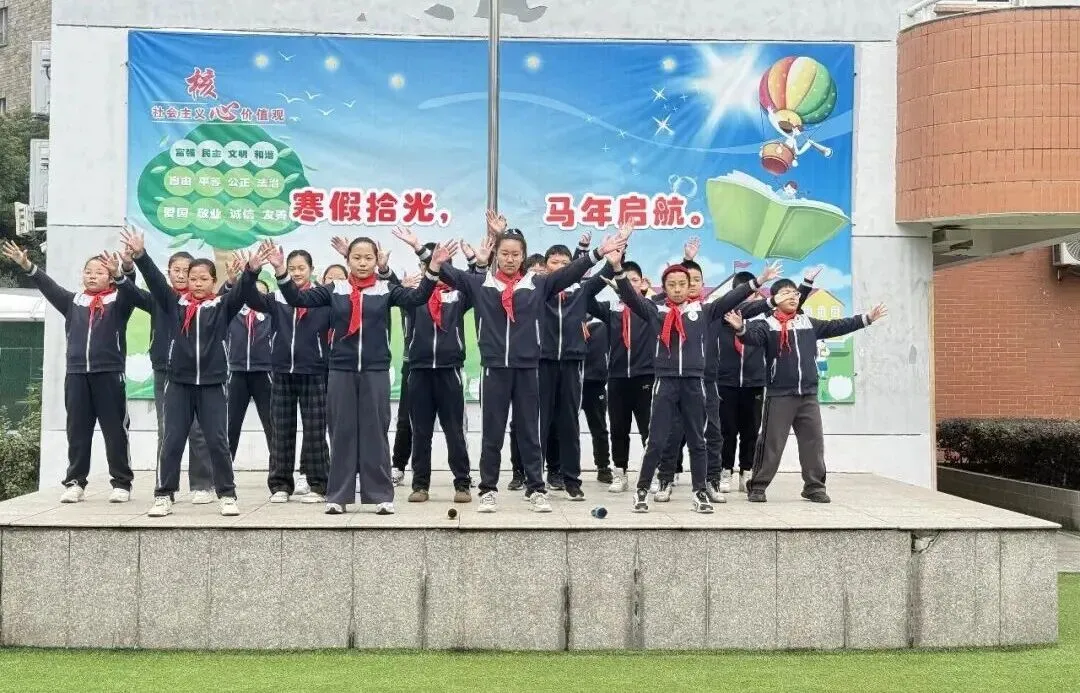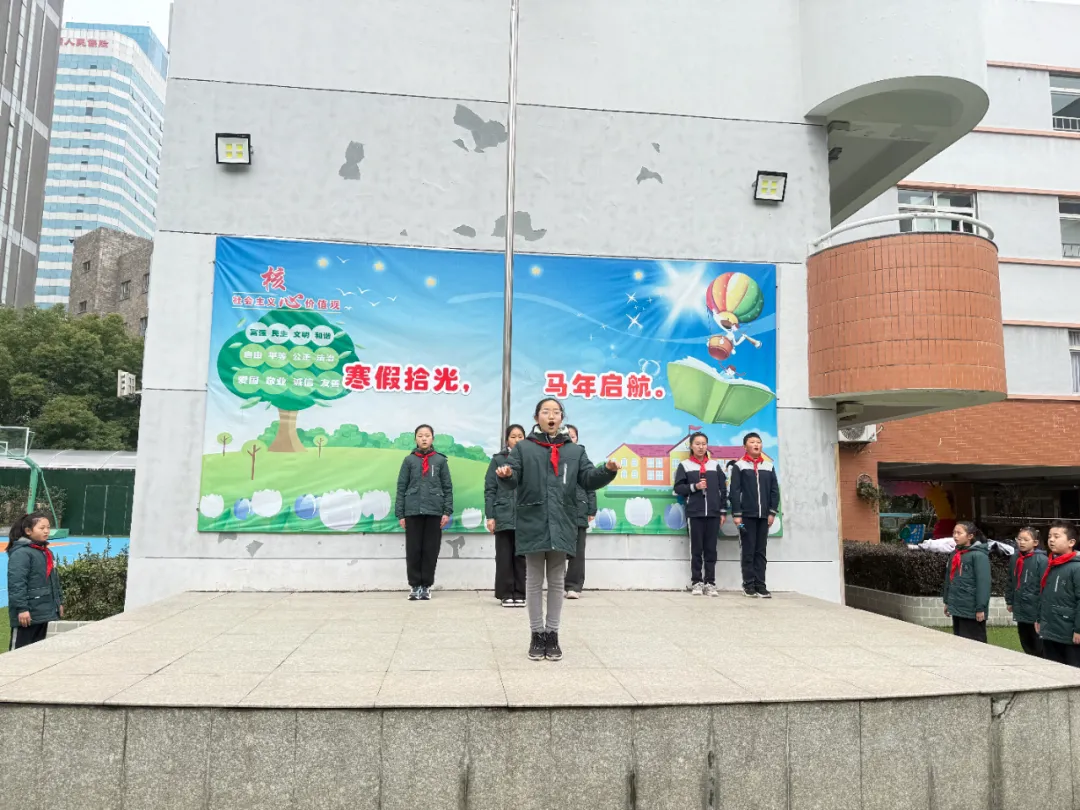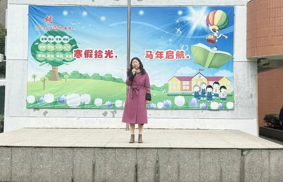 吴校长为新学期致辞,向全体师生送上马年新期望。她充分肯定了队员们在寒假实践中的精彩表现,点赞大家在研学、创作、安全学习中的成长与收获。她勉励全体少先队员,在“生成教育”的滋养下,主动学习、勇于实践、乐于创造,在学习中积累,在活动中成长,在挑战中进步,努力成长为有理想、有本领、有担当的新时代好少年。